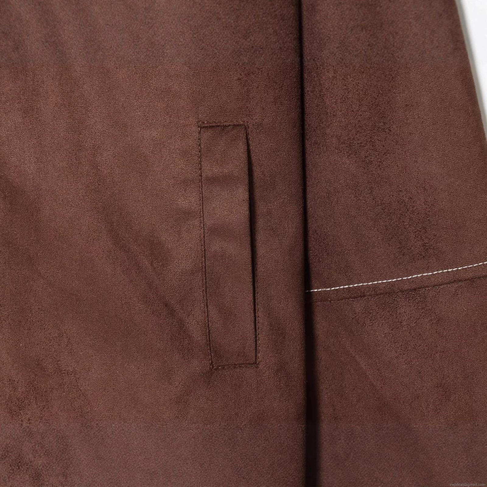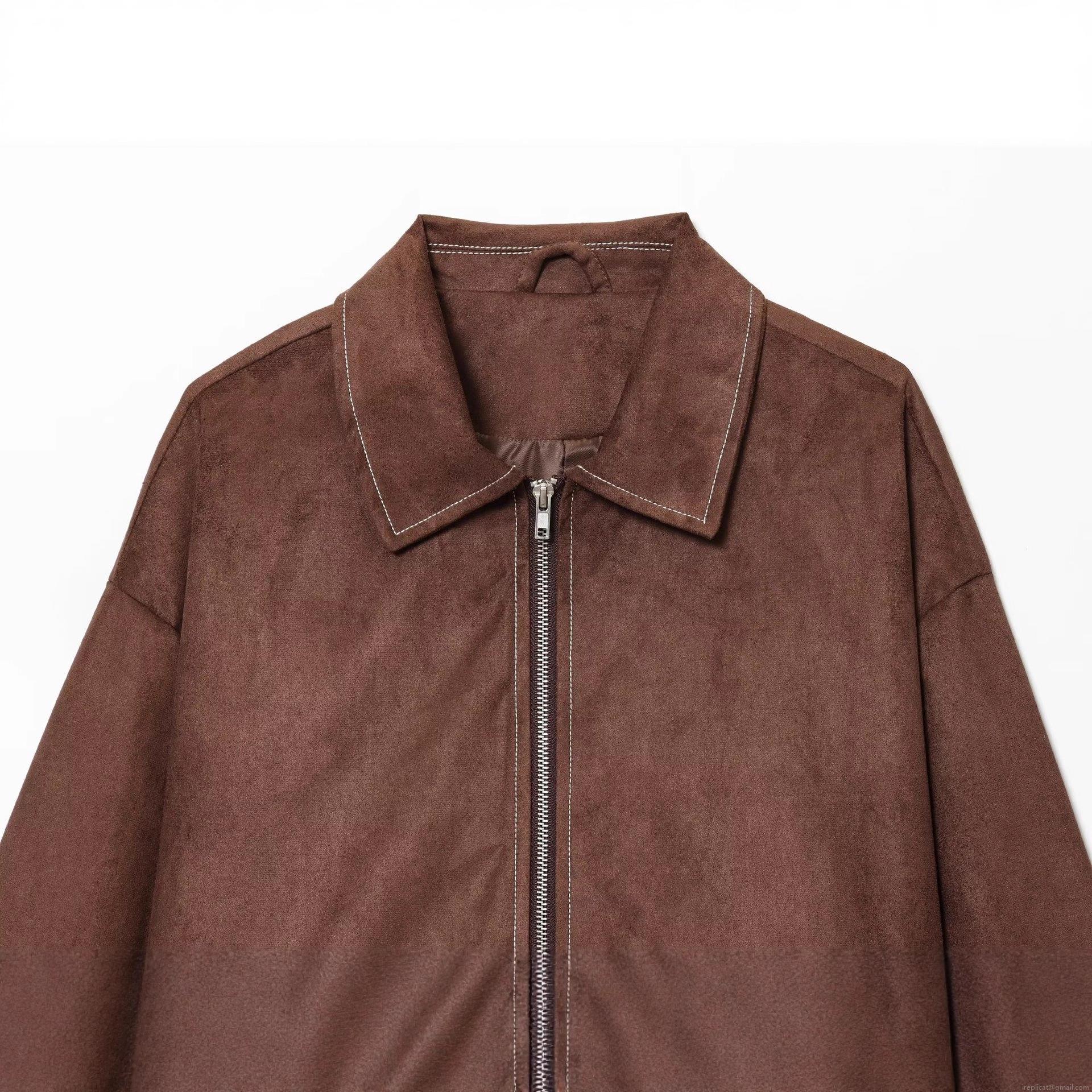 Women Fashion Faux Suede Jacket Vintage Contrast Stitching Lapel Long Sleeve Zipper Outerwear Casual Streetwear Loose Coat For Autumn Winter