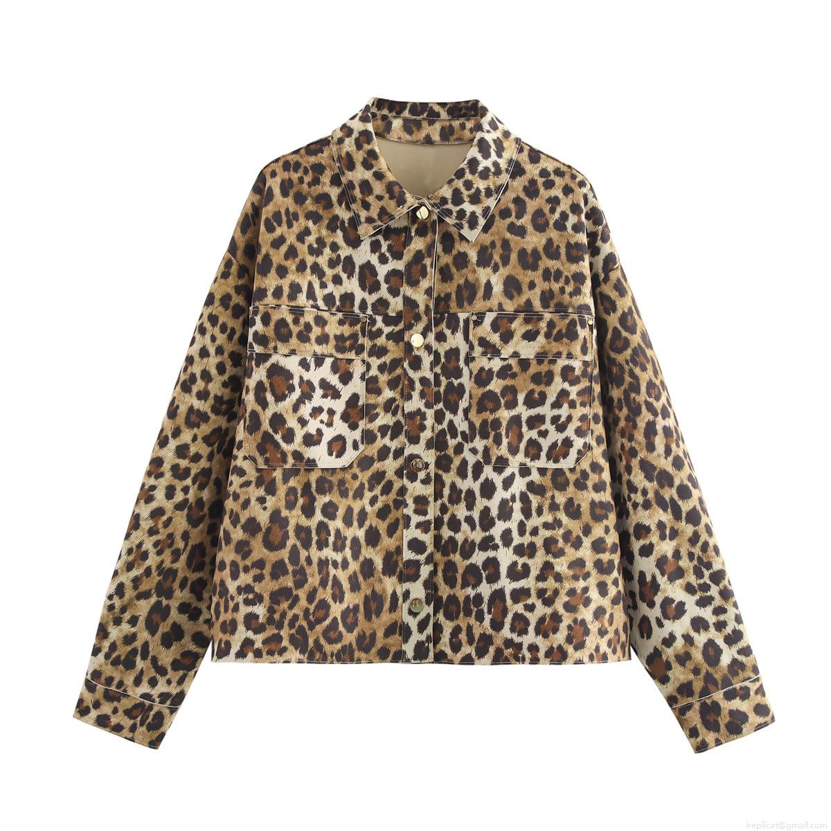 Women's Leopard Print Denim Jacket Loose Fit Raw Hem Cropped Jean...