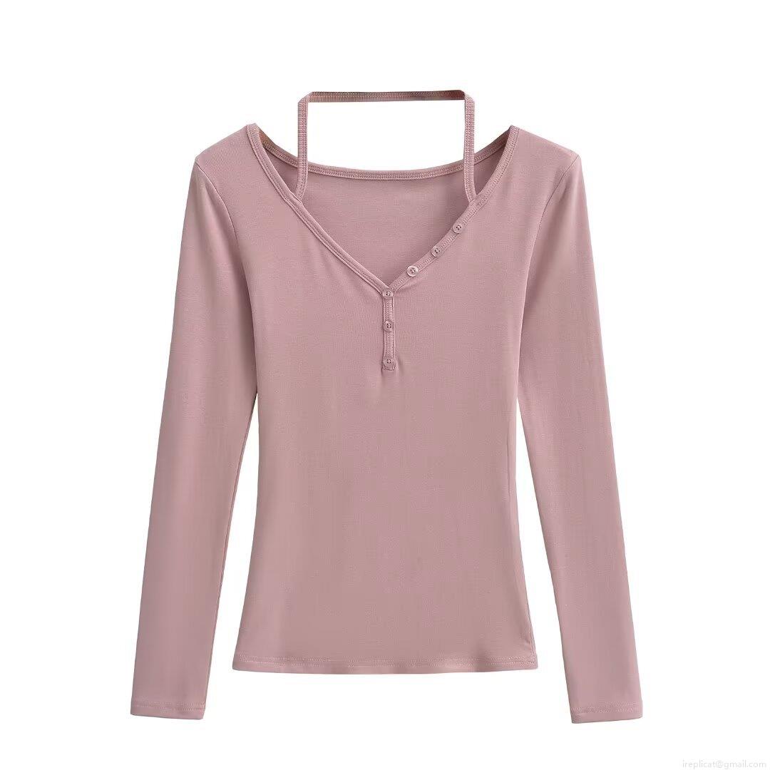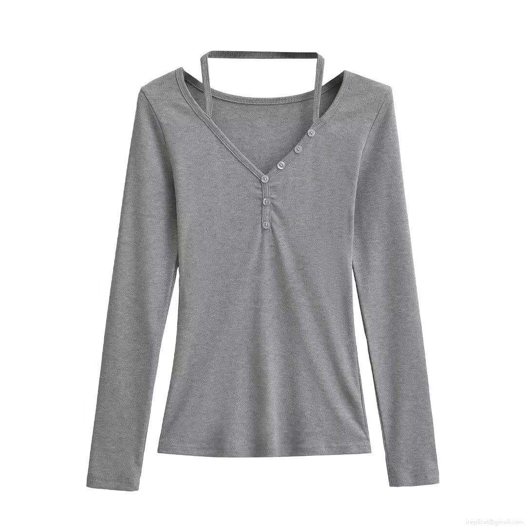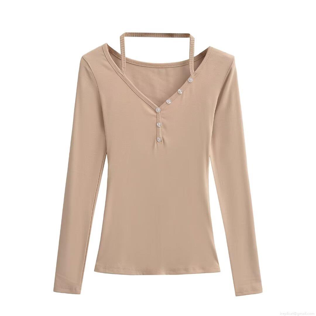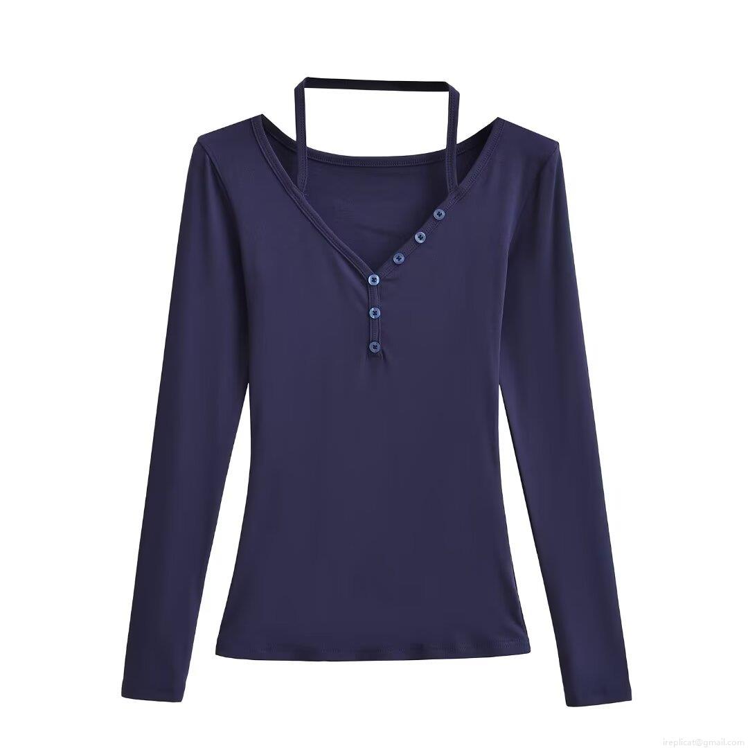 Women Fashion Halter Neck Button Decor V Neck Long Sleeve T-Shirt Slim Fit Solid Color Polyester Knit Base Layer Top Streetwear Casual Autumn Winter