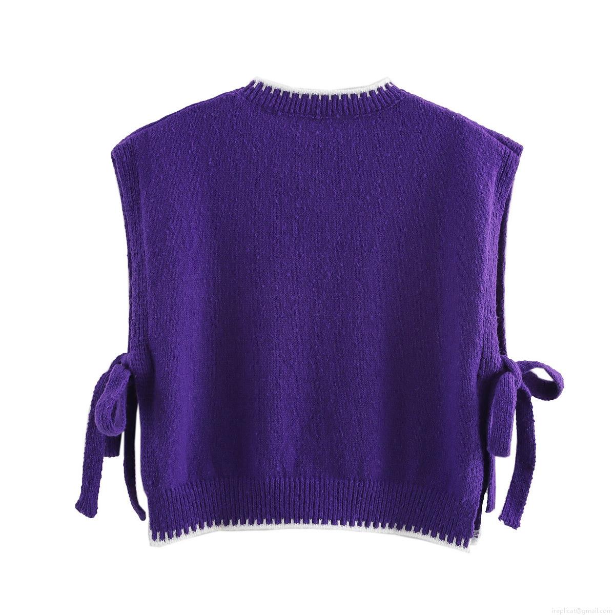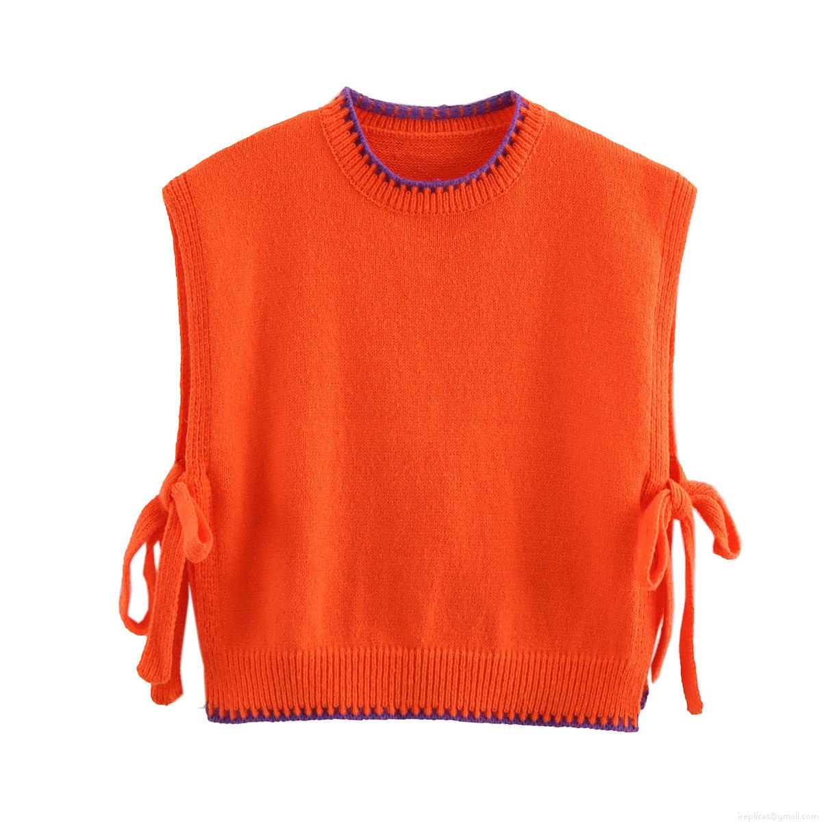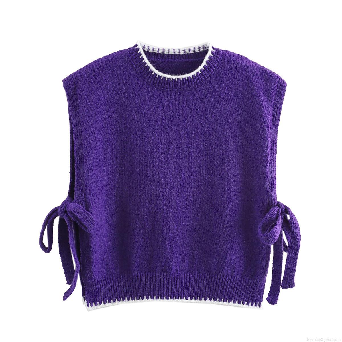 Women Fashion Knitted Vest Sleeveless Round Neck Contrast Trim Side Lace-Up Knit Waistcoat Pullover Sweater Tank Top for Spring Autumn Casual Streetwear