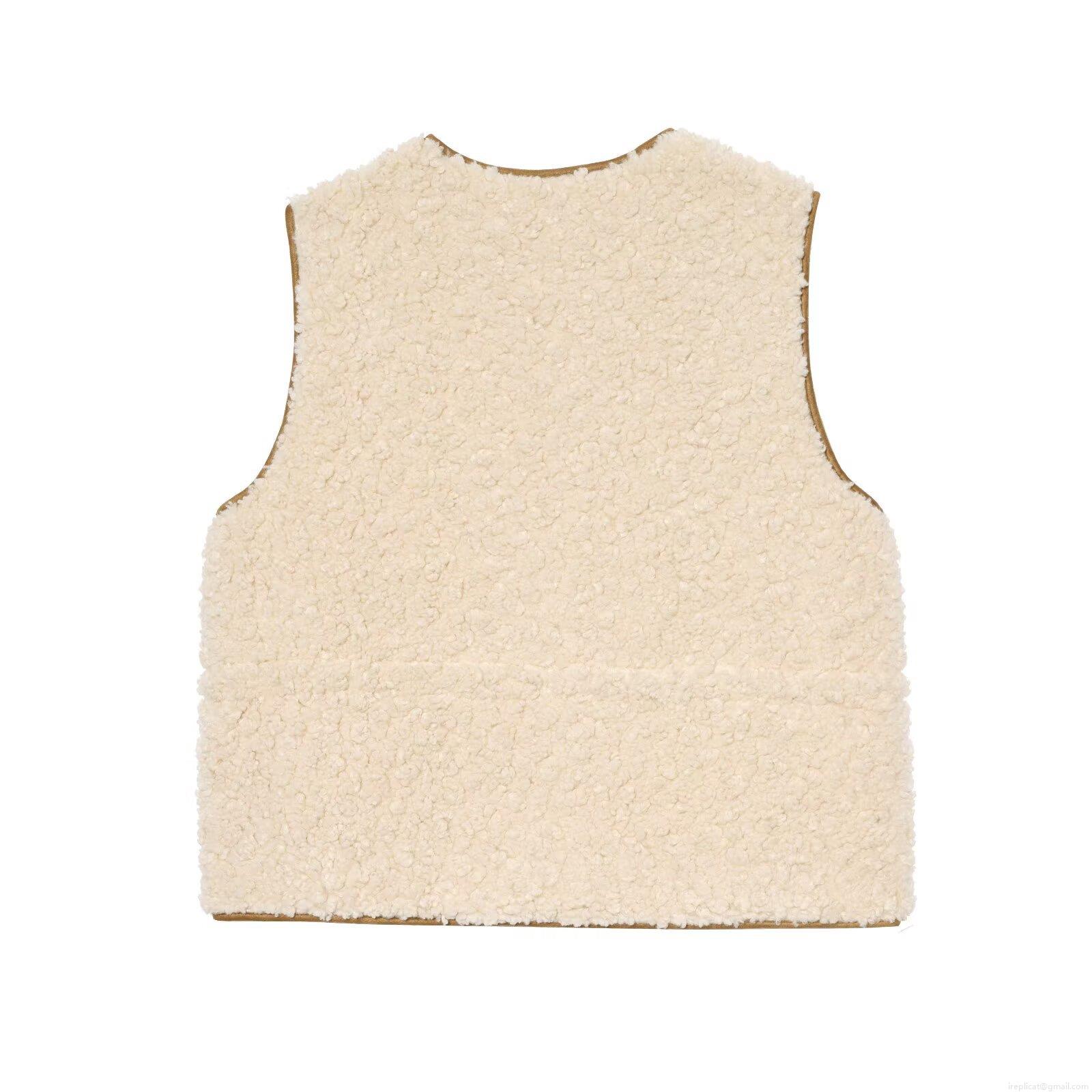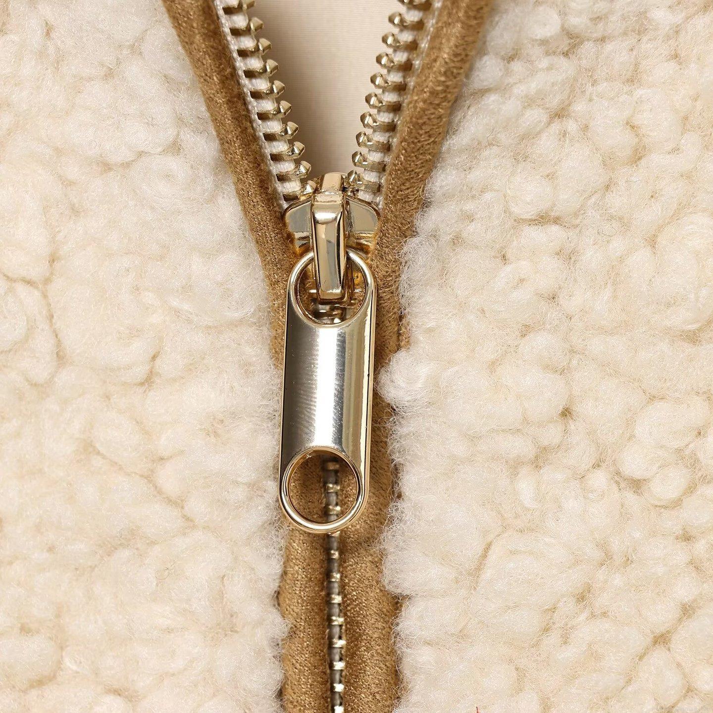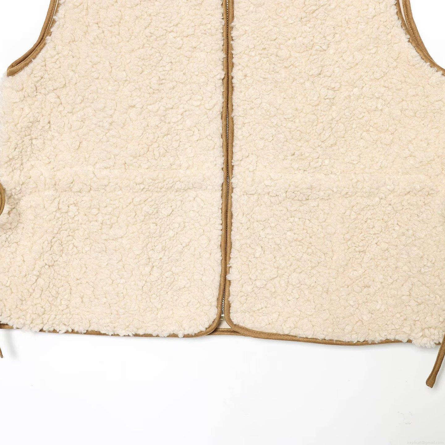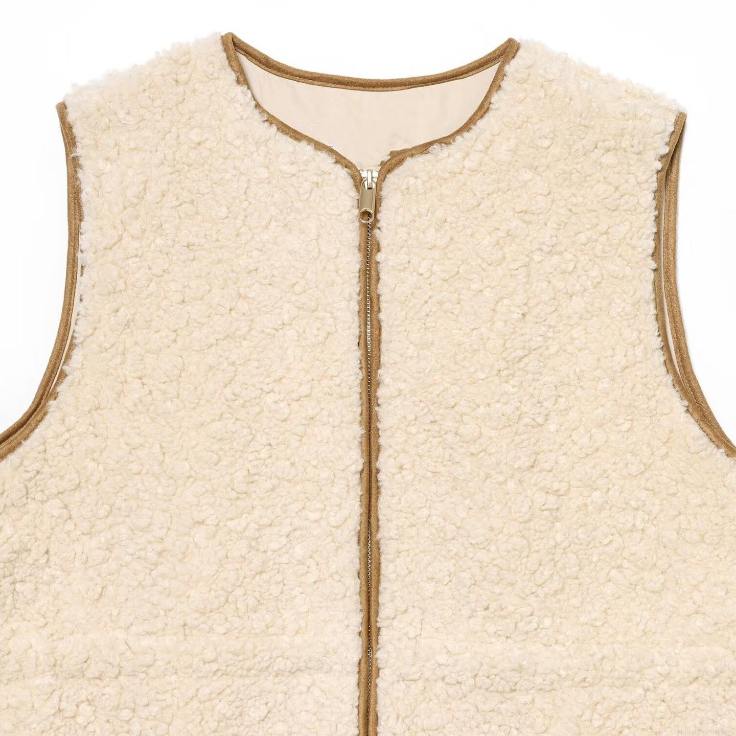 Women Fashion Lambswool Vest Beige Solid Color Sweet Zip Up Sleeveless Jacket With Adjustable Drawstring Waist Winter Warm Fleece Outerwear