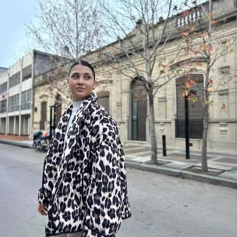 Women Fashion Leopard Print Quilted Jacket Casual Loose Long Sleeve Pockets Lightweight Cardigan Coat For Autumn Winter Streetwear