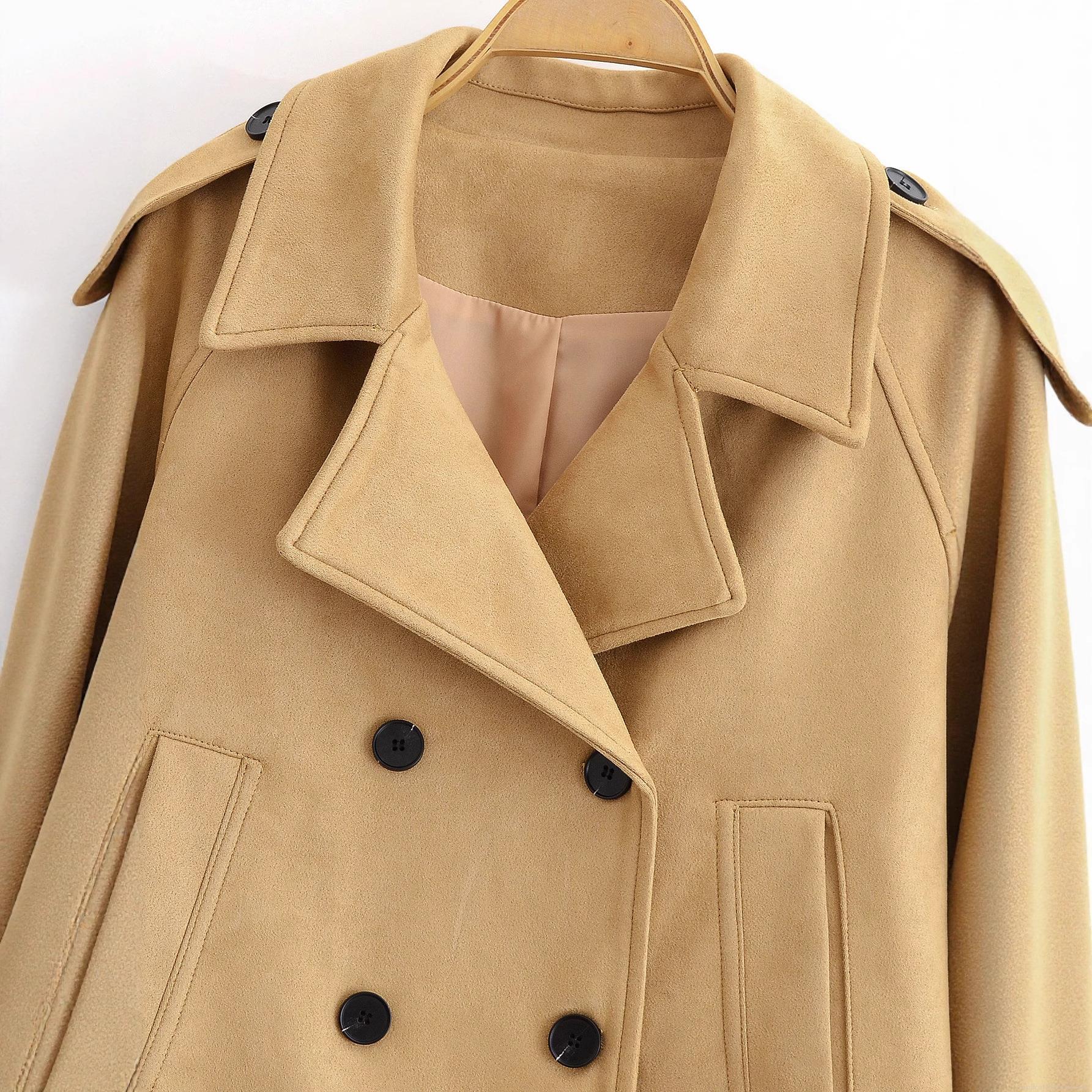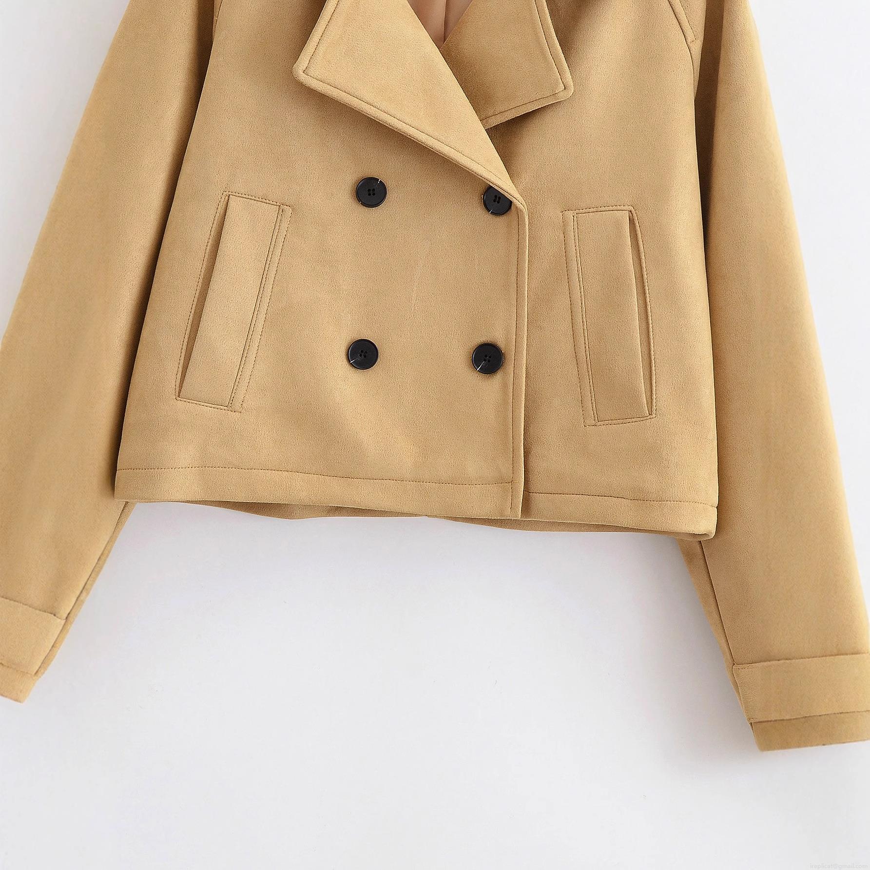 Women Fashion Short Faux Suede Double Breasted Jacket With Lapel Epaulettes Casual Solid Color Long Sleeve Cropped Trench Outerwear For Ladies