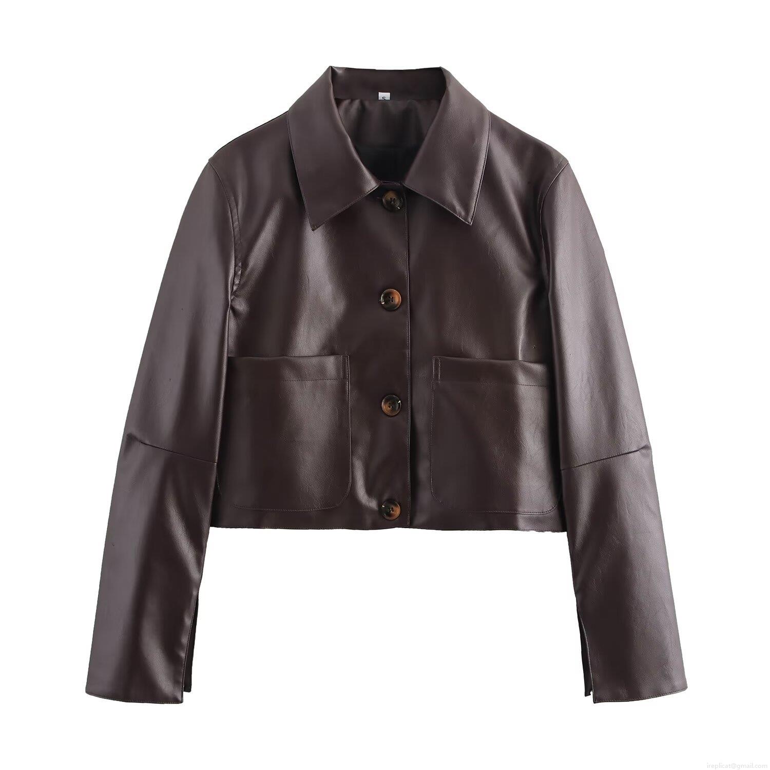 Women Fashion Short PU Leather Jacket Vintage Lapel Single Breasted Long Sleeve Faux Leather Outwear With Pockets Streetwear Bomber Jacket For Women