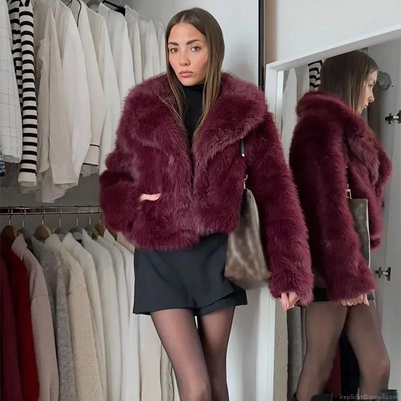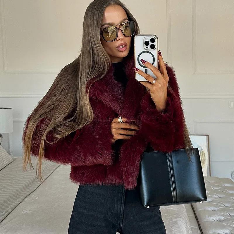 Women Faux Fur Coat Elegant Wine Red Lapel Short Jacket Long Sleeve Thick Warm Winter Outerwear Streetwear For Ladies Party