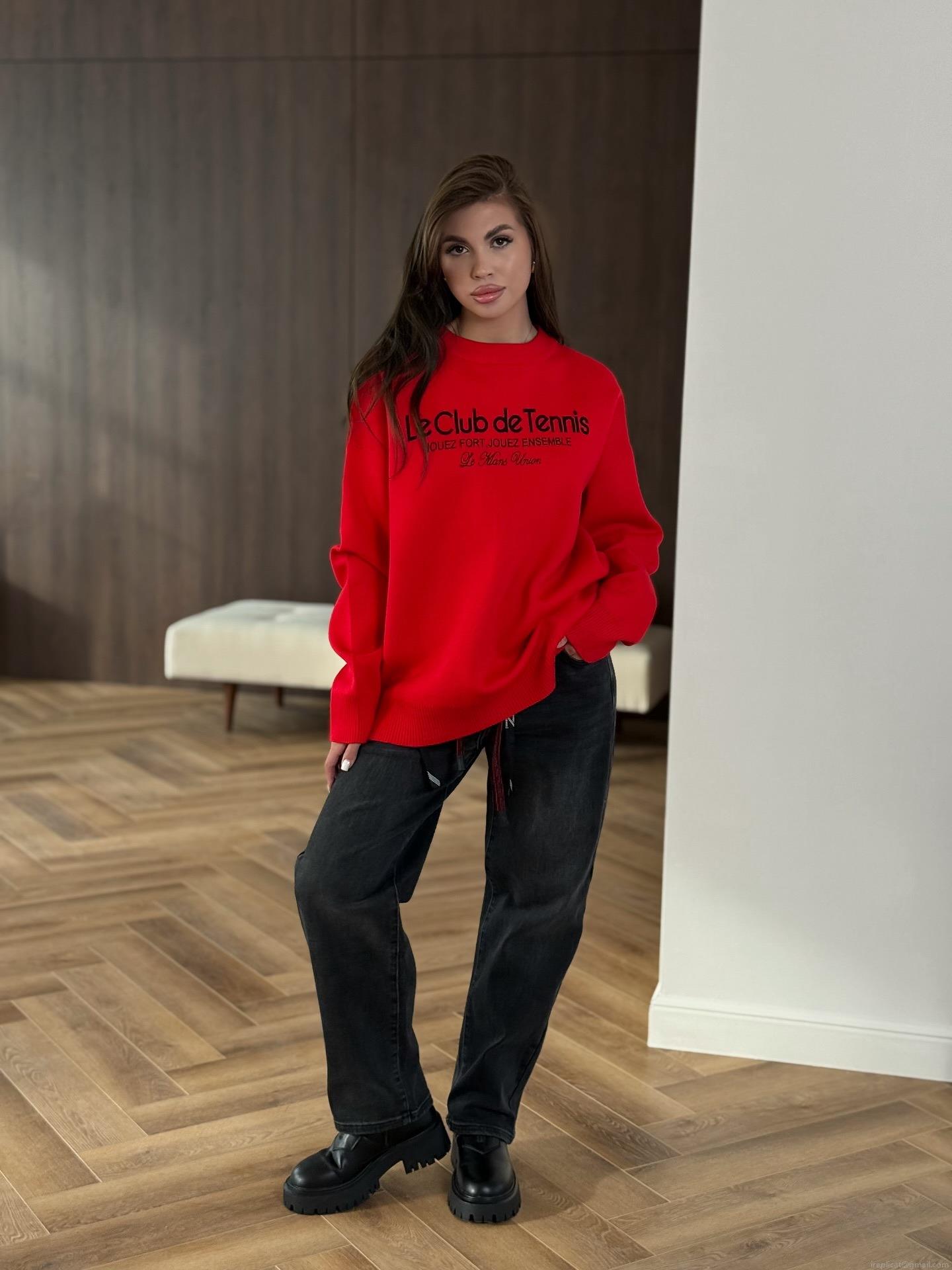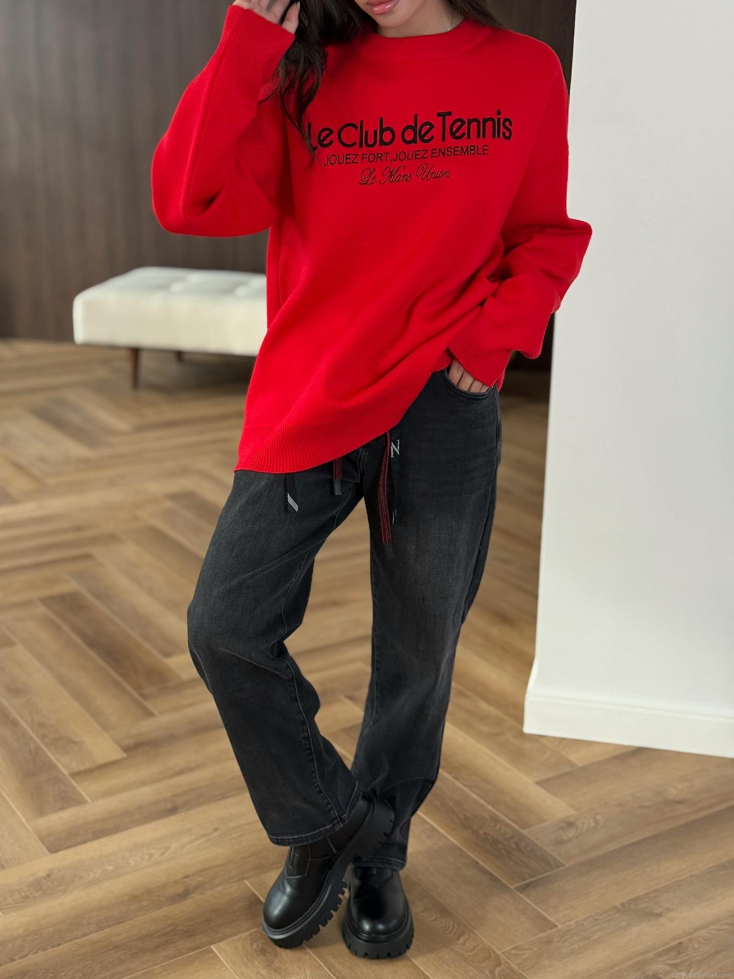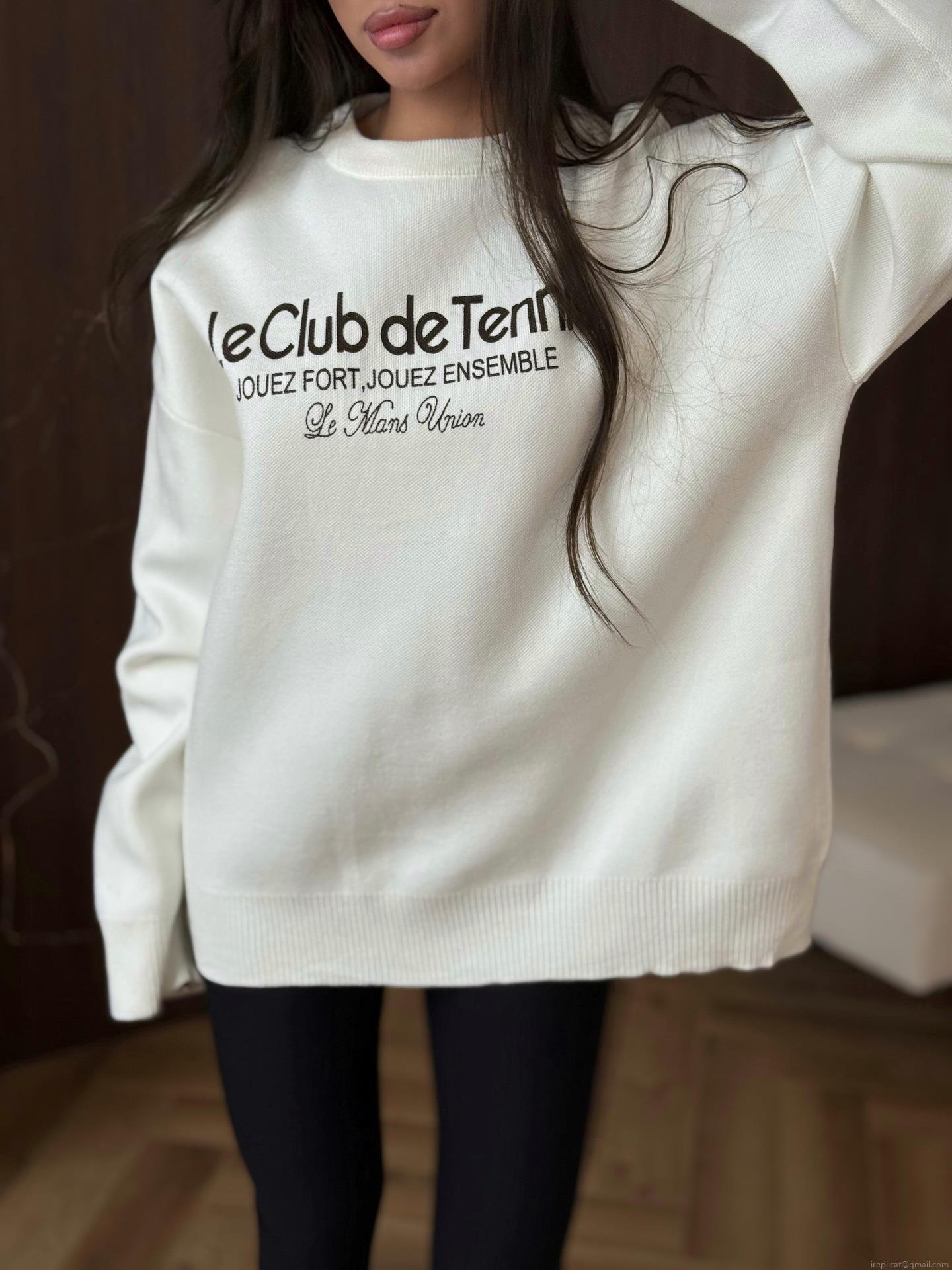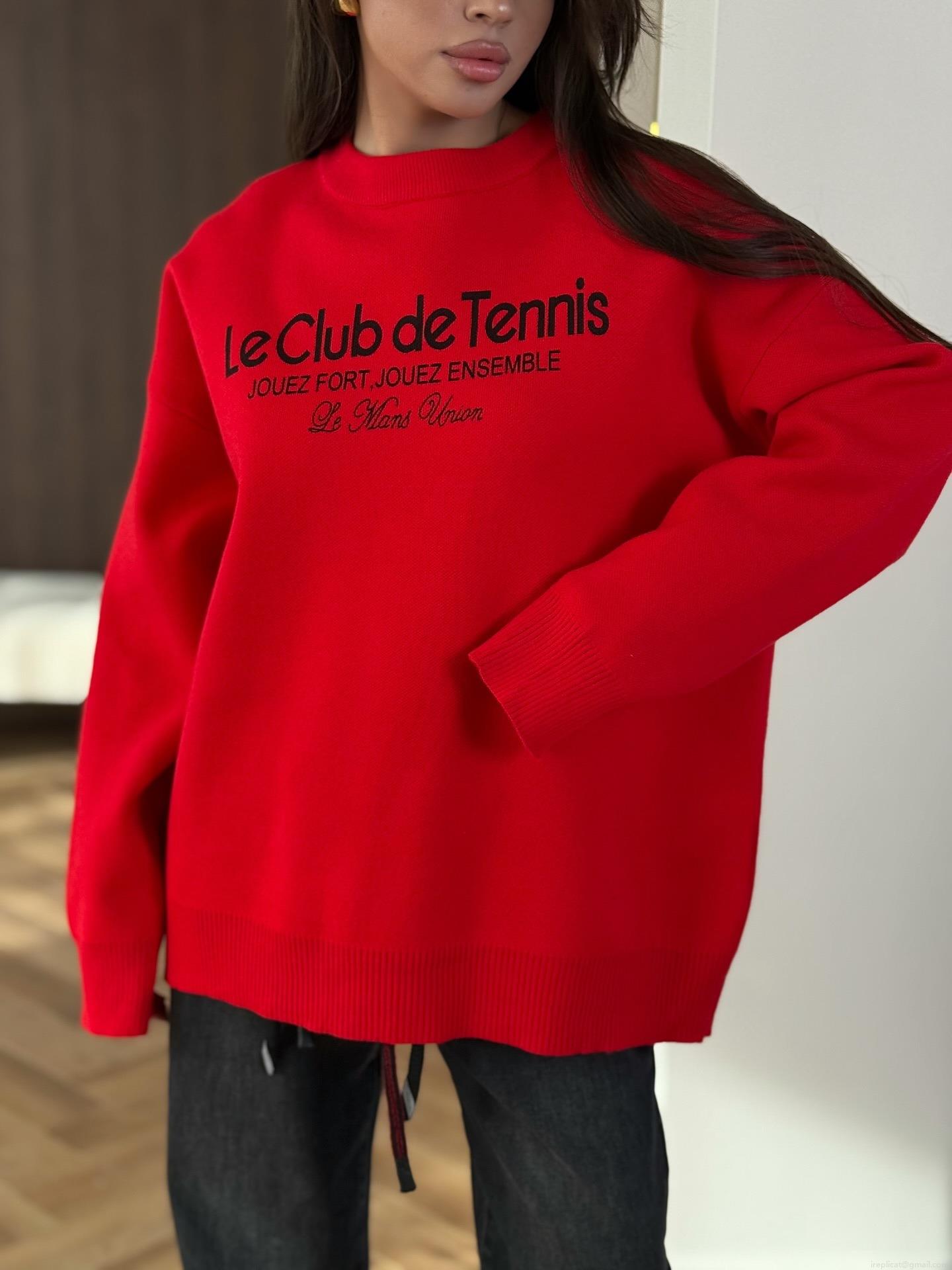Women French Retro Le Club de Tennis Letter Print Oversized Sweater Casual Acrylic Polyester Blend Knit Round Neck Long Sleeve Pullover Tops For Autumn Winter Daily Streetwear