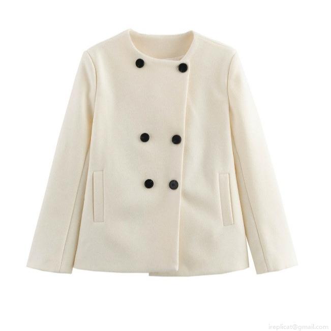 Women French Style Double Breasted Round Neck Woolen Coat Solid Color Loose Fit Long Sleeve Mid Length Casual Outerwear Warm Elegant Jacket For Autumn Winter Spring