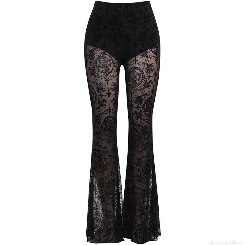Women Gothic Black Lace Flared Pants High Waist Mesh Flocking Cross Portrait Print Bell Bottom Trousers Sexy Streetwear Party Clubwear Slender Fit