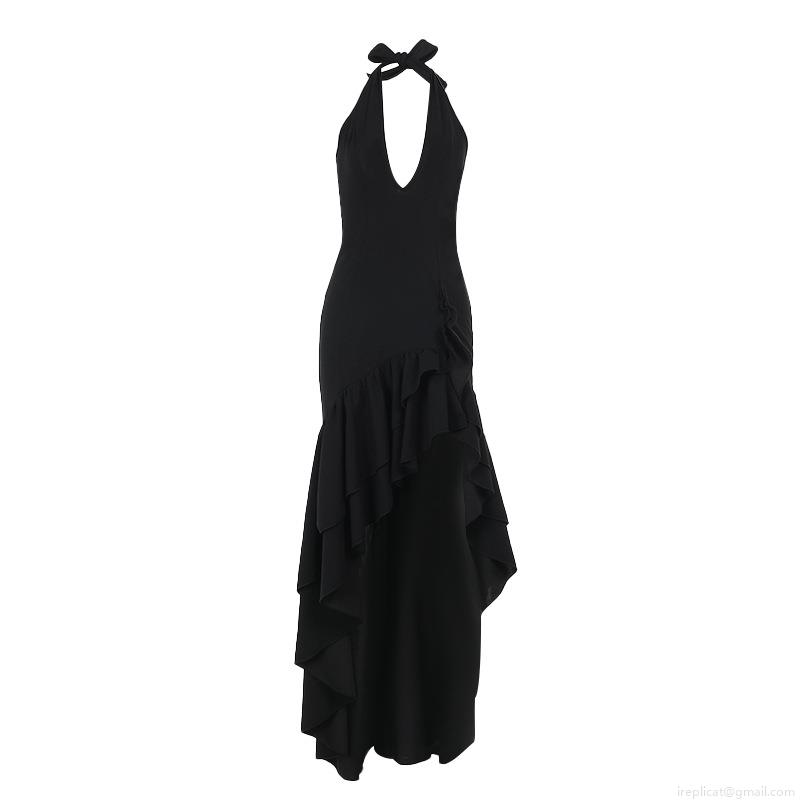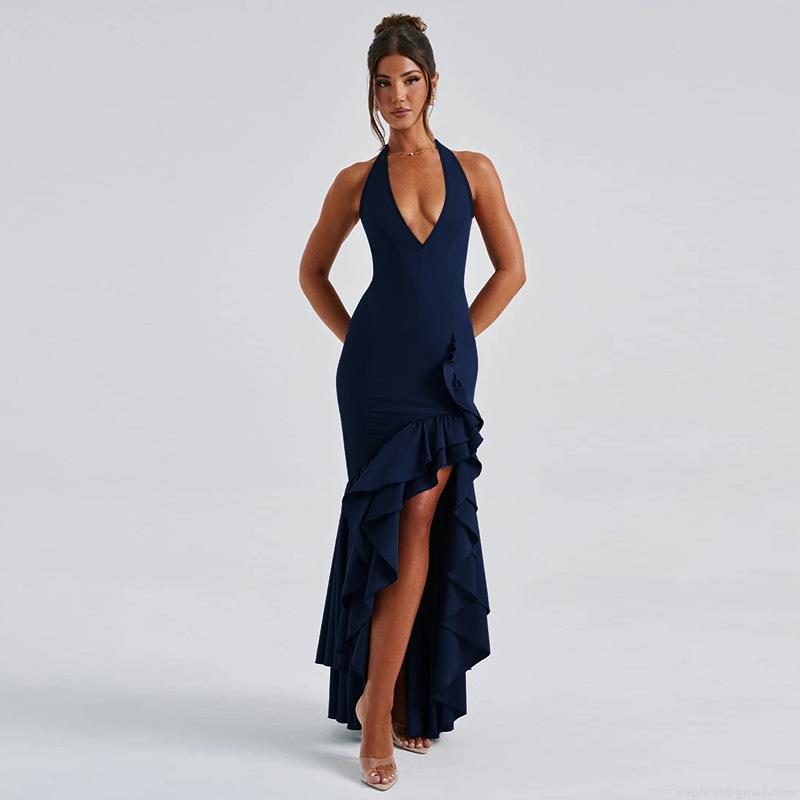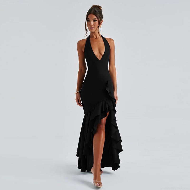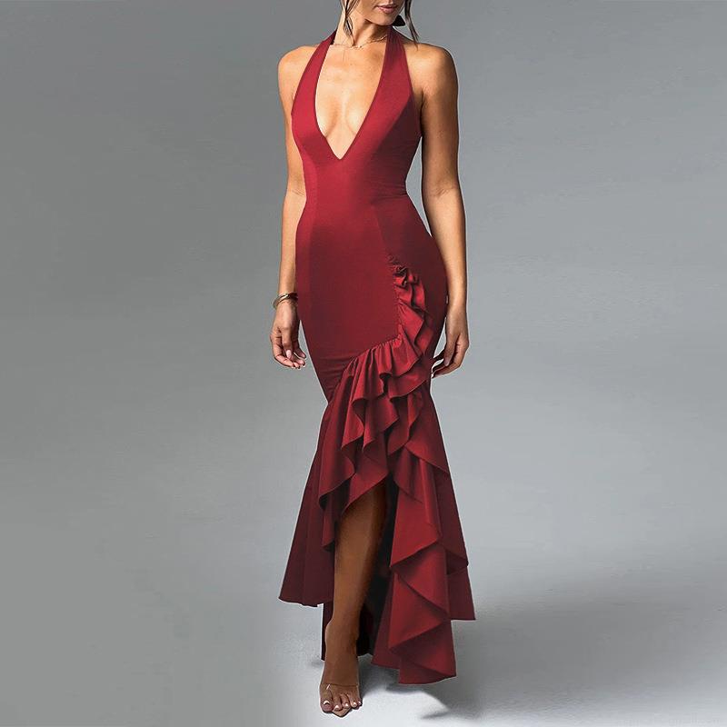 Women Halter Deep V Neck Sexy Bodycon Dress Elegant Ruffle Fishtail High Slit Backless Evening Party Maxi Dress High Waist Polyester Spandex Cocktail Gown