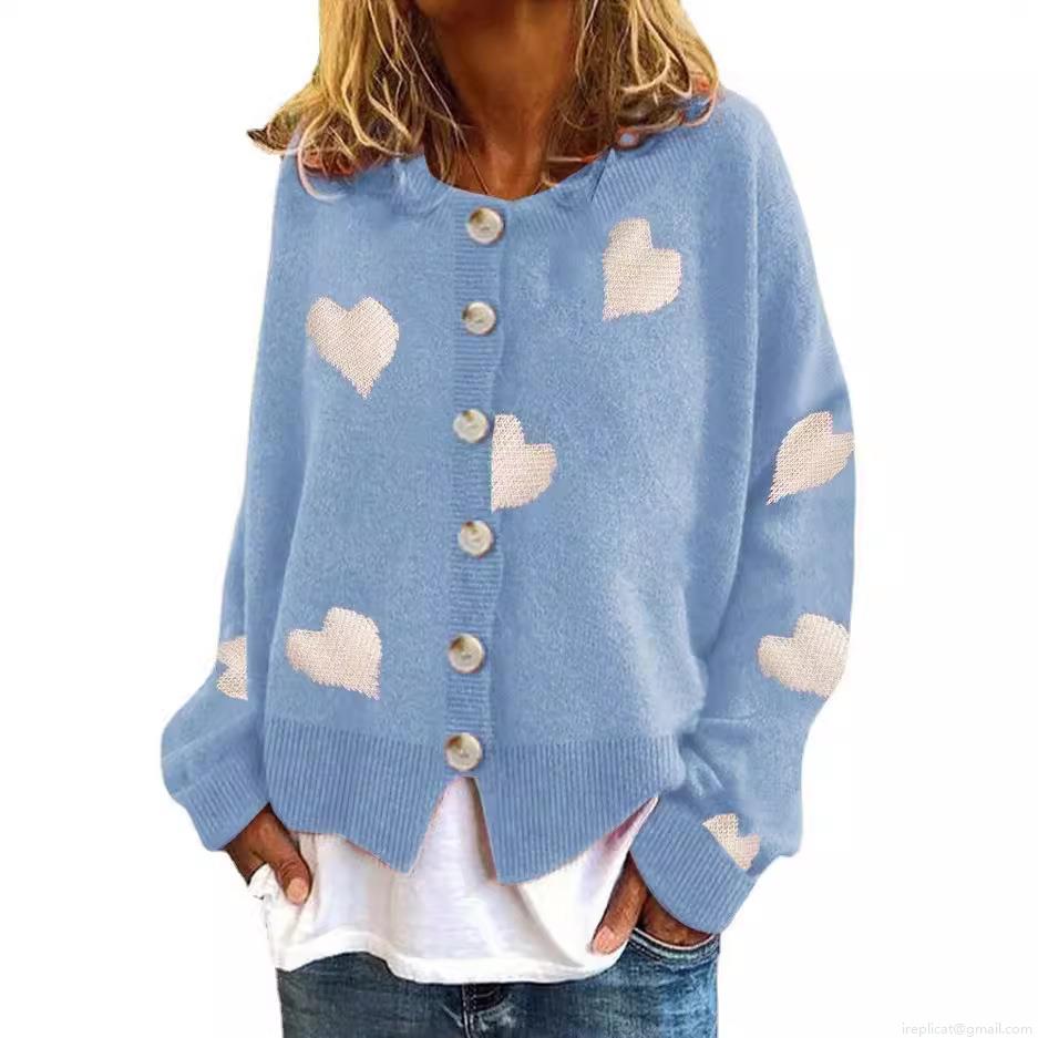 Women Heart Pattern Knitted Cardigan Sweater Long Sleeve Single Breasted O-Neck Loose Fit Knit Outerwear Sweet Casual Fall Winter Tops