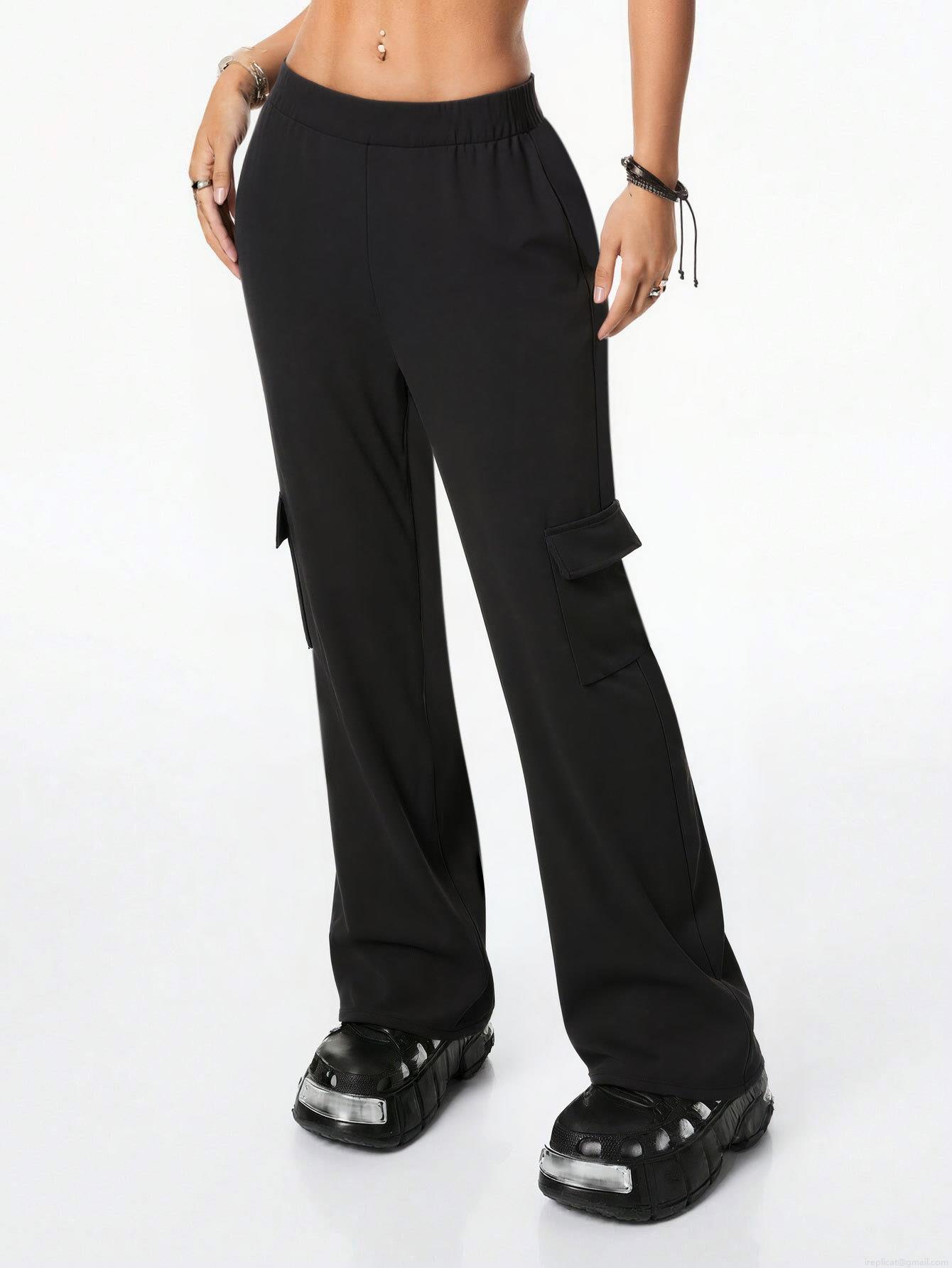 Women High Waist Cargo Flare Pants Elastic Waist Solid Black Trousers With Side Large Pockets Fashion Casual Streetwear For Ladies 95% Polyester 5% Elastane