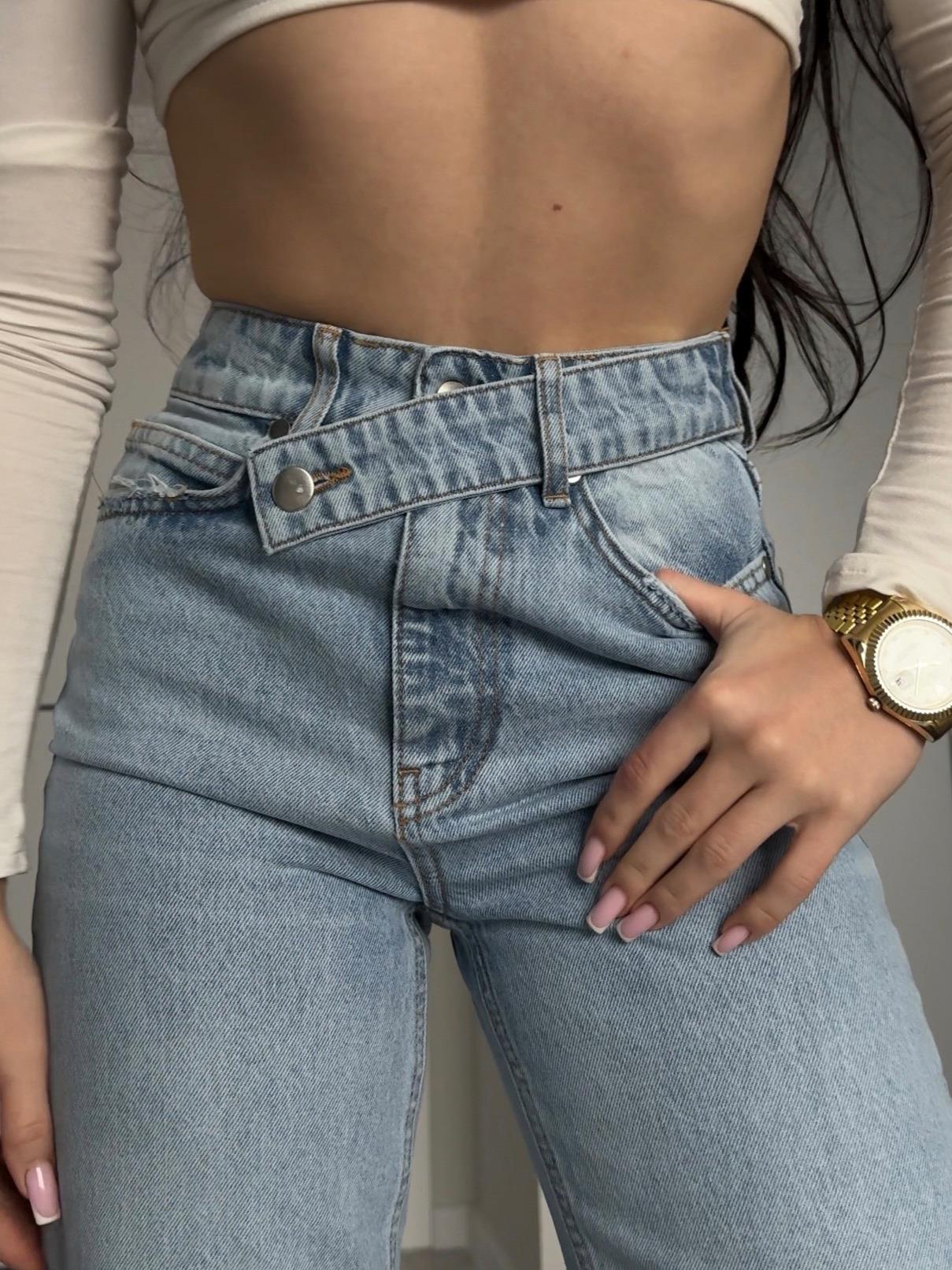 Women High Waist Wide Leg Jeans Asymmetric Criss Cross Waistband Distressed Denim Pants Side Split Hem Streetwear Fashion Long Trousers