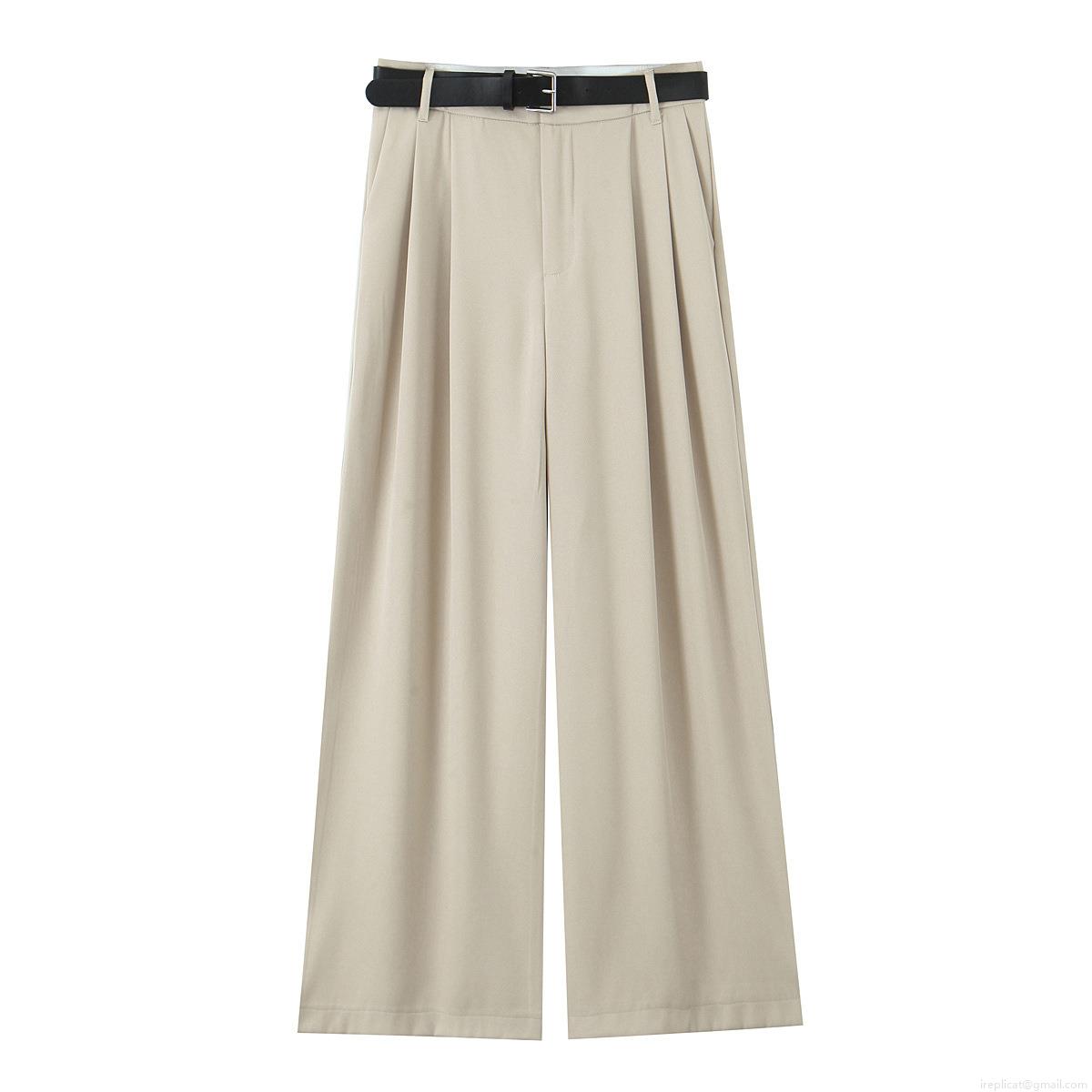 Women High Waist Wide Leg Trousers With Belt Casual Office Commute Double Pleated Loose Long Pants Polyester Suit Fabric Pants