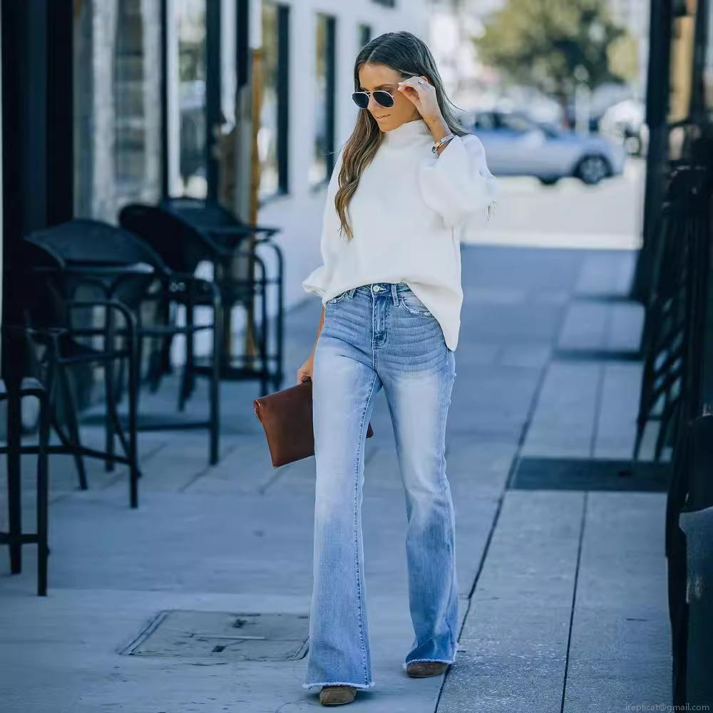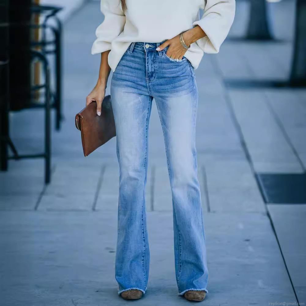 Women High Waisted Flare Jeans Washed Light Blue Denim Pants With Raw Hem Stretchy Bell Bottom Trousers For Casual Urban Commute Fashion