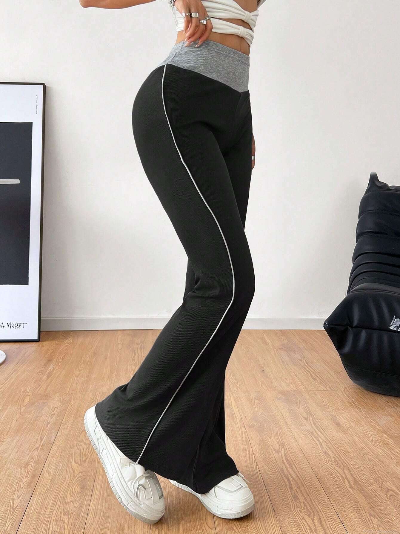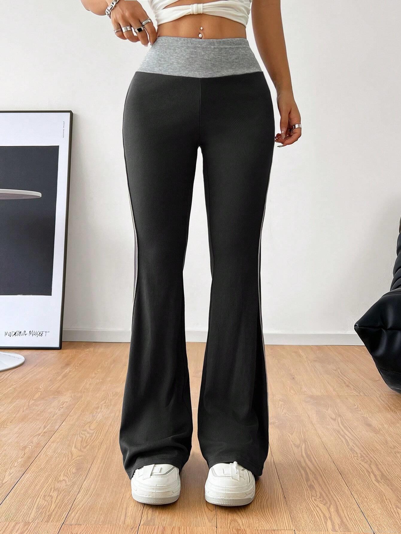 Women High Waisted Flared Pants Ribbed Knit Contrasting Color Waist Side Stripe Slim Fit Casual Commuter Trousers For Women Autumn Winter Viscose Blend Stretchy Flare Leggings