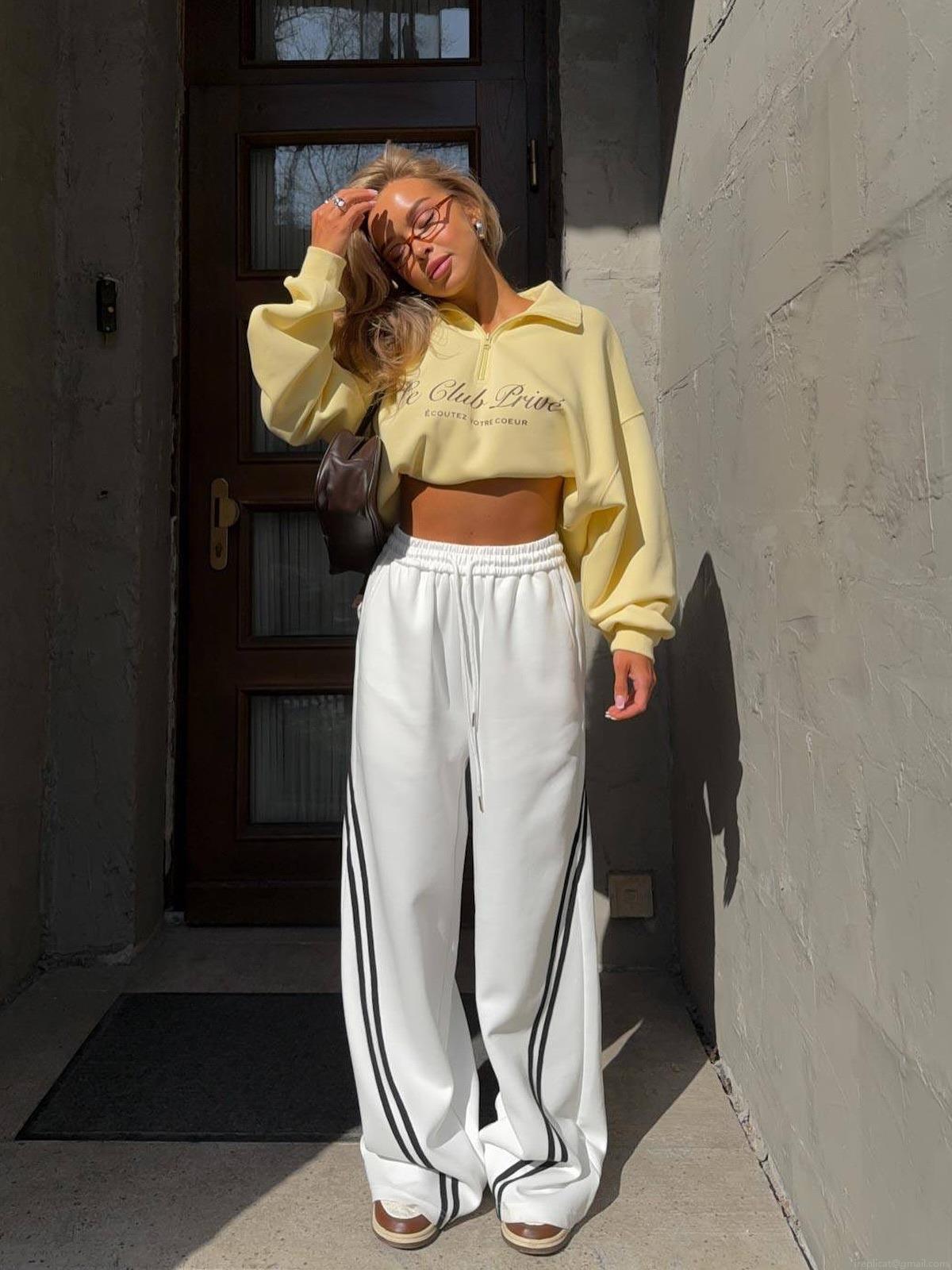 Women High Waisted Wide Leg Sweatpants 100% Cotton Side Striped Casual Tracksuit Bottoms Autumn Loose Streetwear Joggers Wide Leg Pants