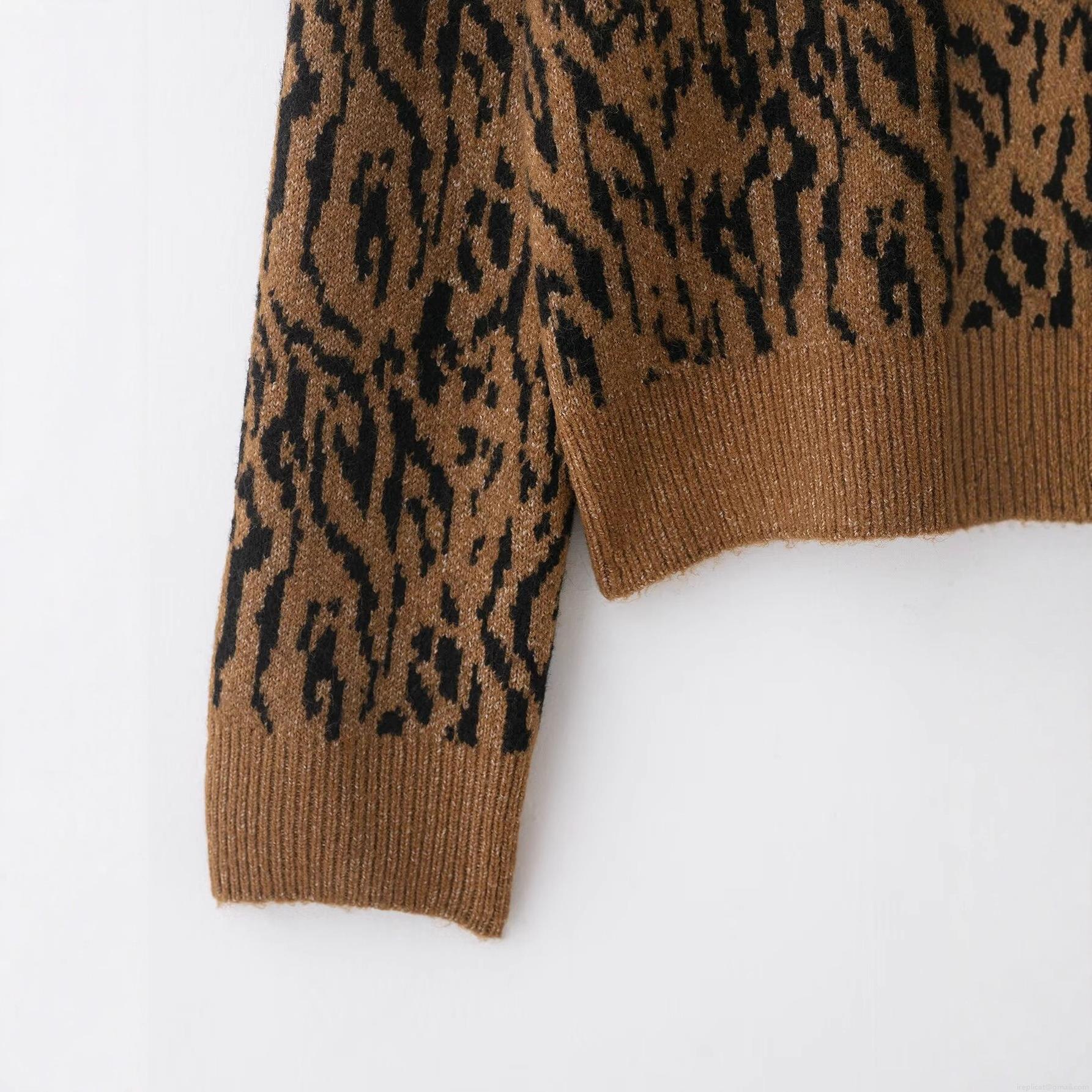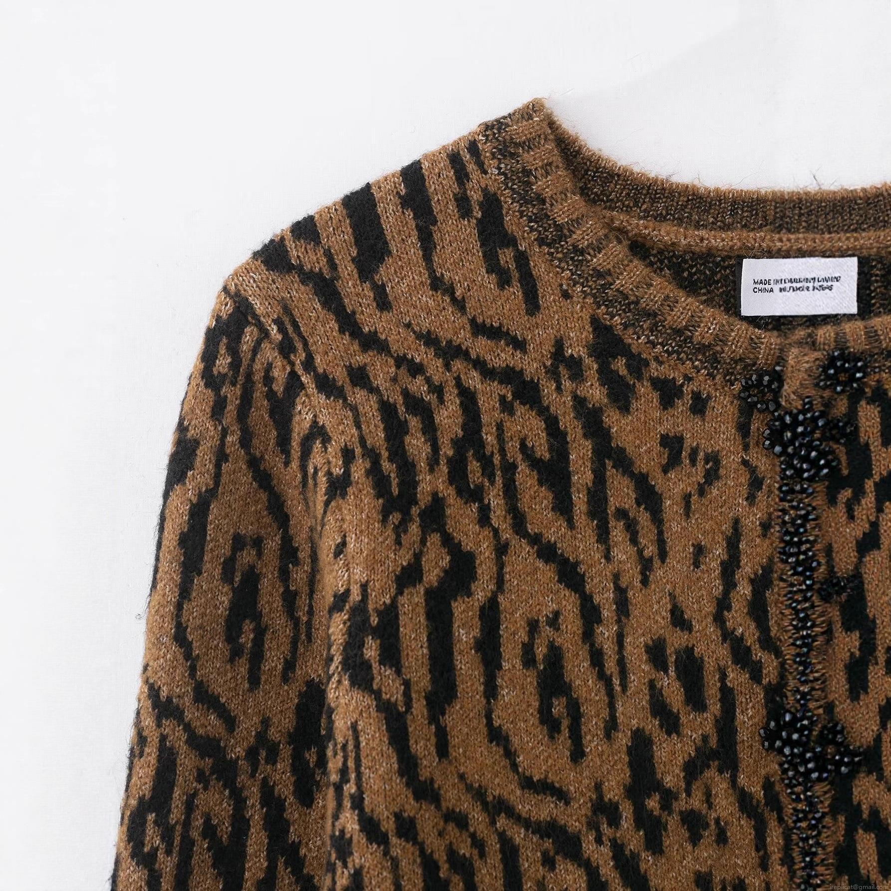Women Leopard Print Knitted Cardigan Sweater Round Neck Long Sleeve Single Breasted Beaded Flower Button Tops Autumn Winter Casual Street Style Knitwear