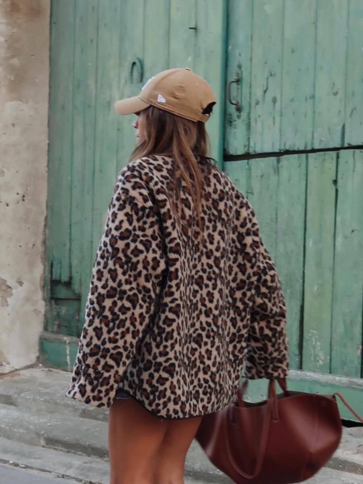 Women Leopard Print Lamb Wool Fleece Jacket Loose Round Neck Long Sleeve Warm Outerwear Casual Streetwear Button Down Coat with Pockets for Autumn Winter