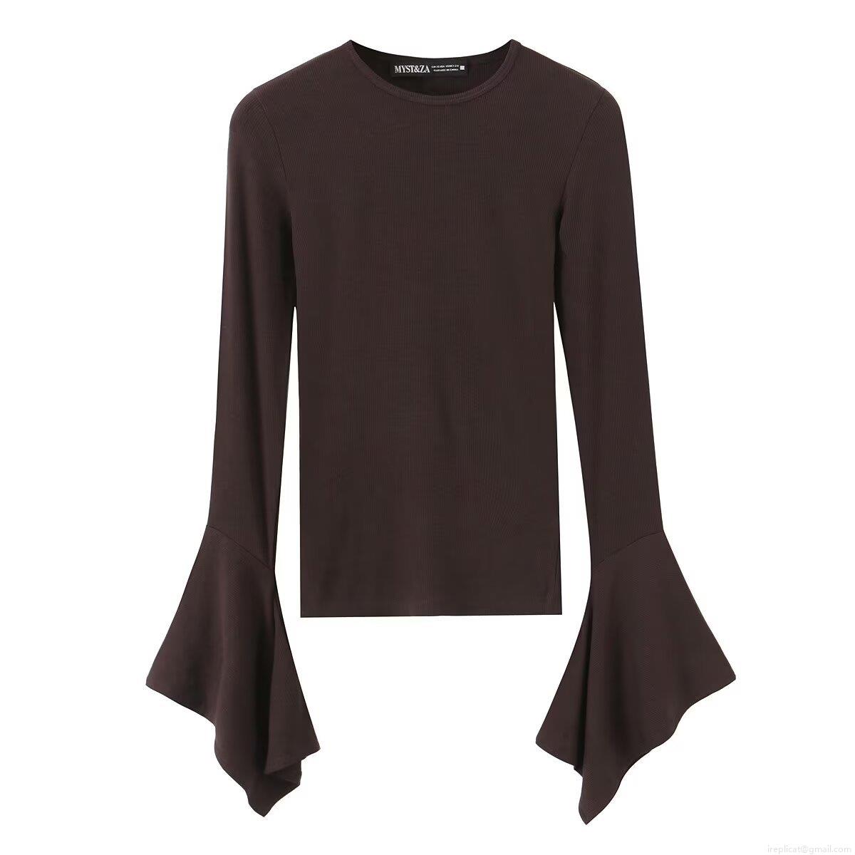 Women Long Sleeve Ribbed Knit Top Polyester Flare Bell Sleeve Pullover Solid Color Slim Fit Round Neck Casual Streetwear Fashion Ladies Tee Shirt