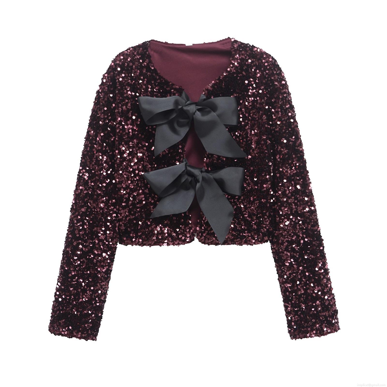 Women Luxury Sequin Cropped Jacket Bolero With Double Satin Bows Long Sleeve Open Front Shrug For Party Evening Wedding Elegant Shiny Outerwear Top