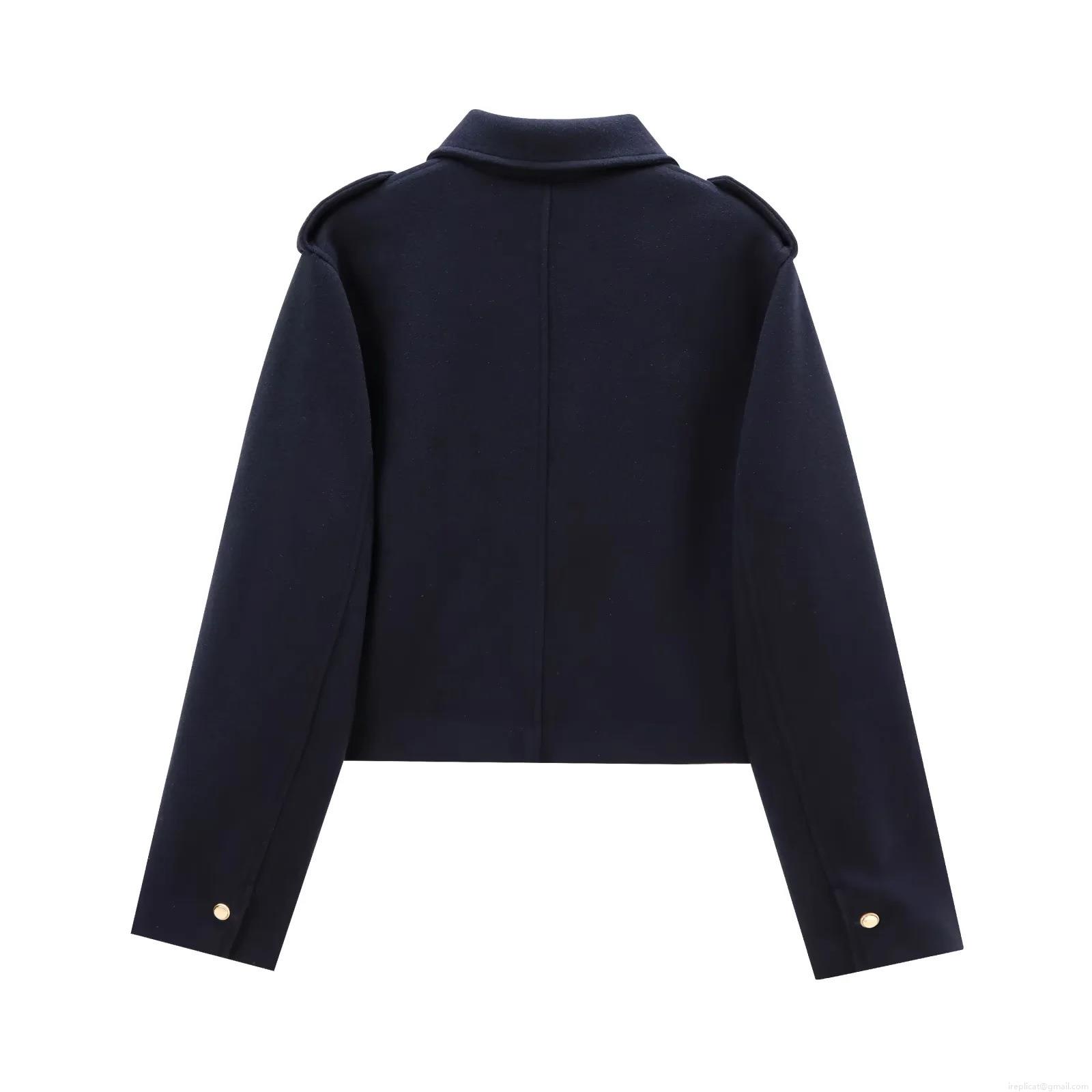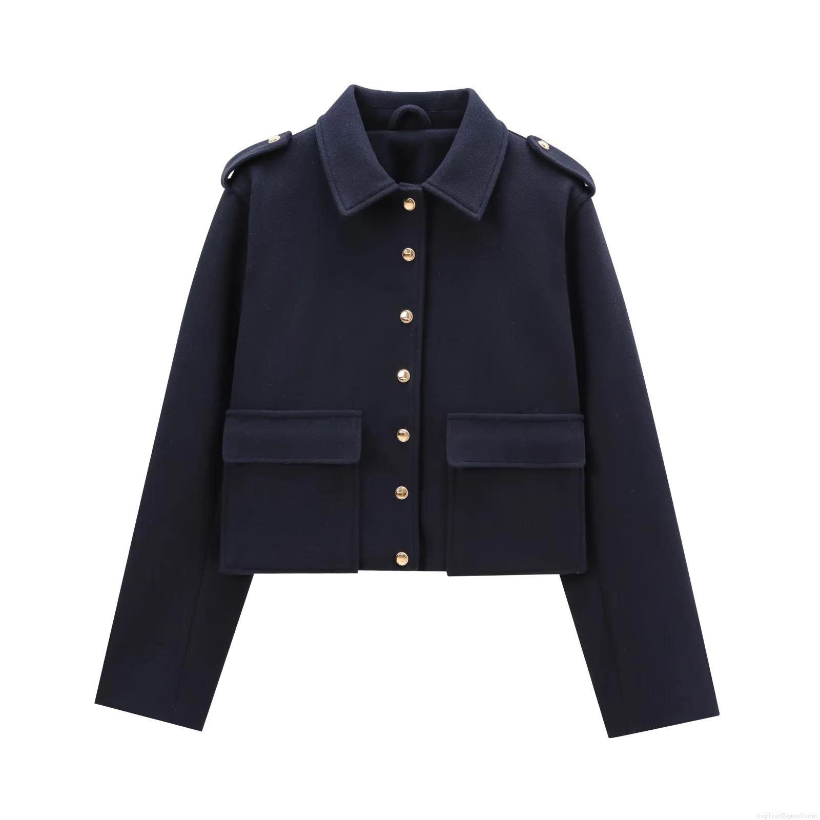 Women Military Style Short Jacket Polyester Wool Blend Lapel Coat With Gold Buttons Epaulettes Casual Solid Outerwear For Ladies