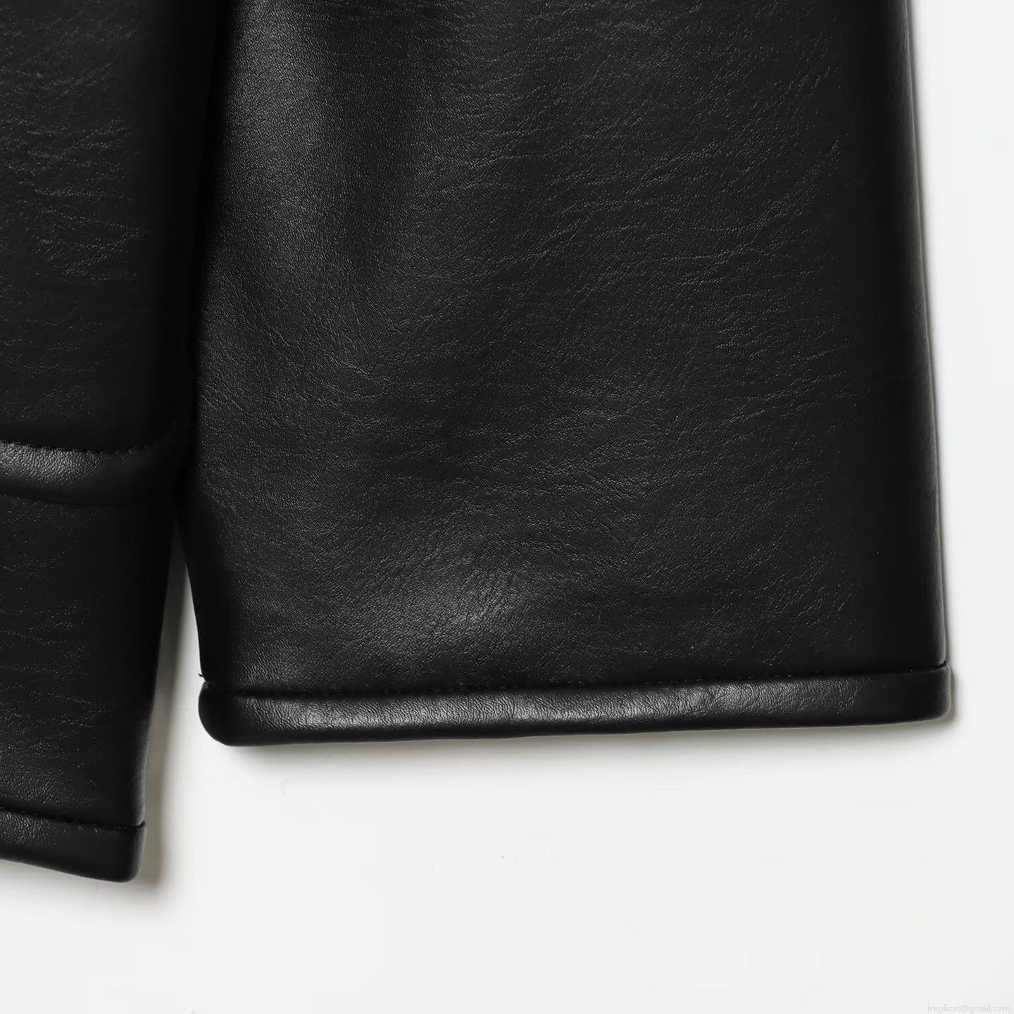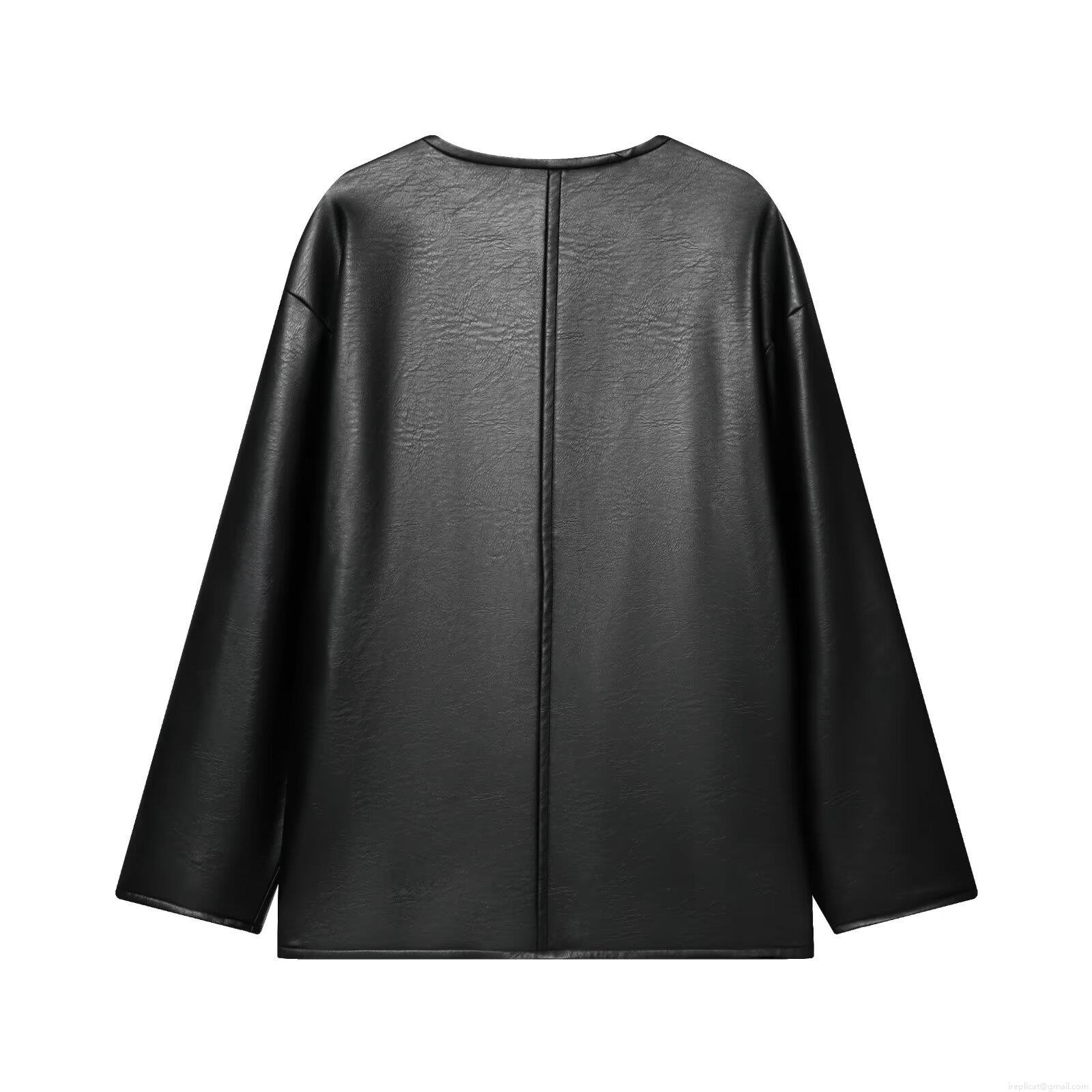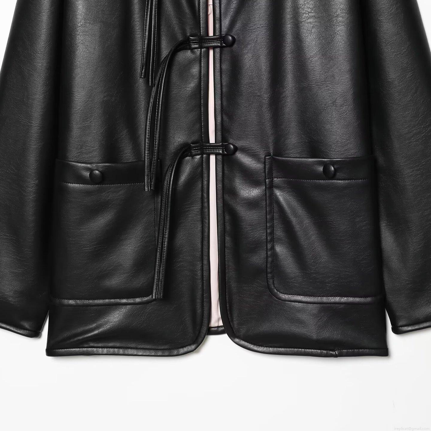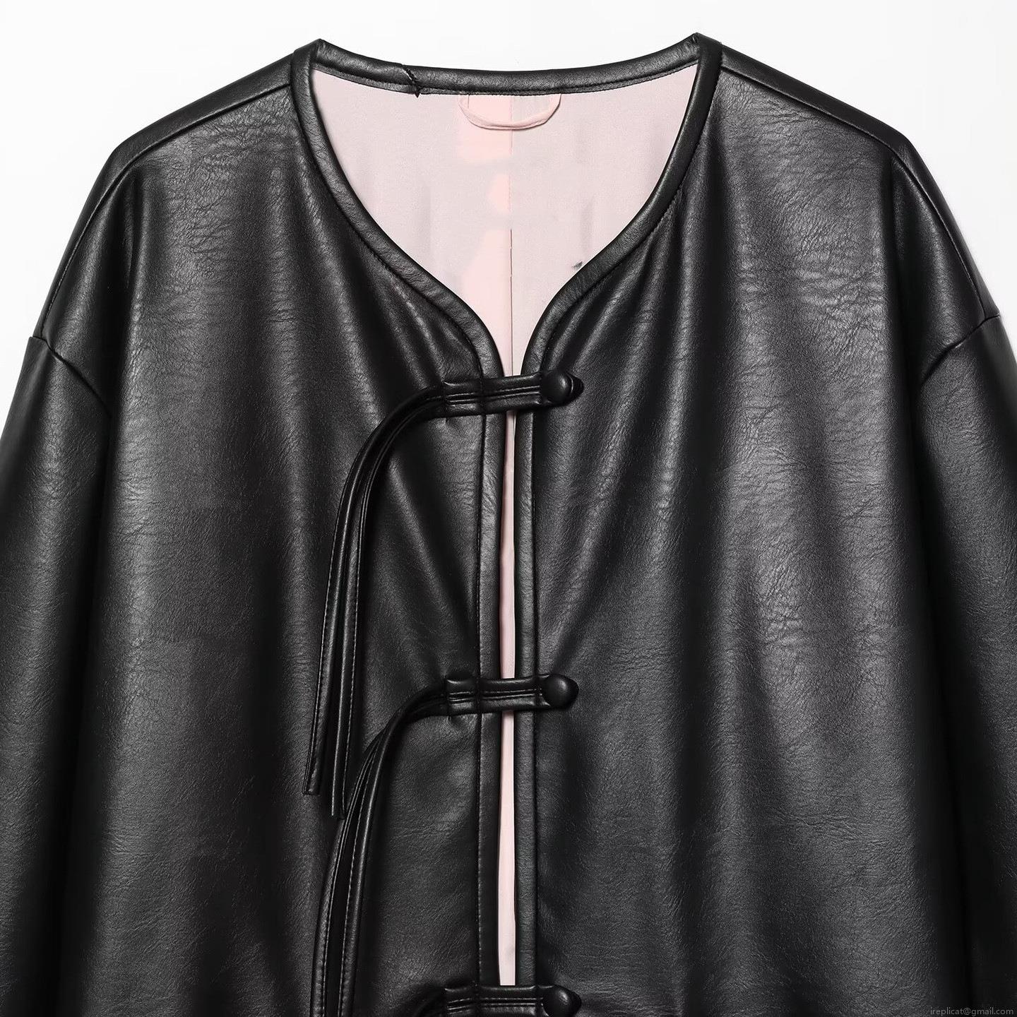 Women New Chinese Style PU Leather Jacket Loose Round Neck Long Sleeve Black Outerwear With Frog Buttons Pink Lining Winter Casual Fashion Coat