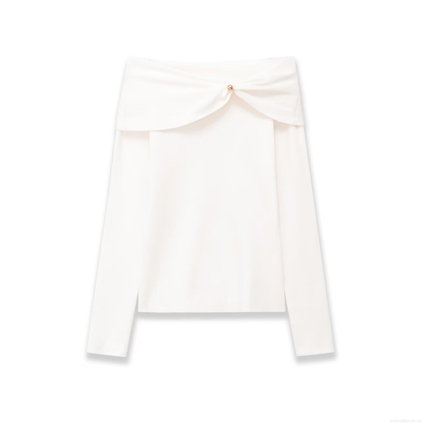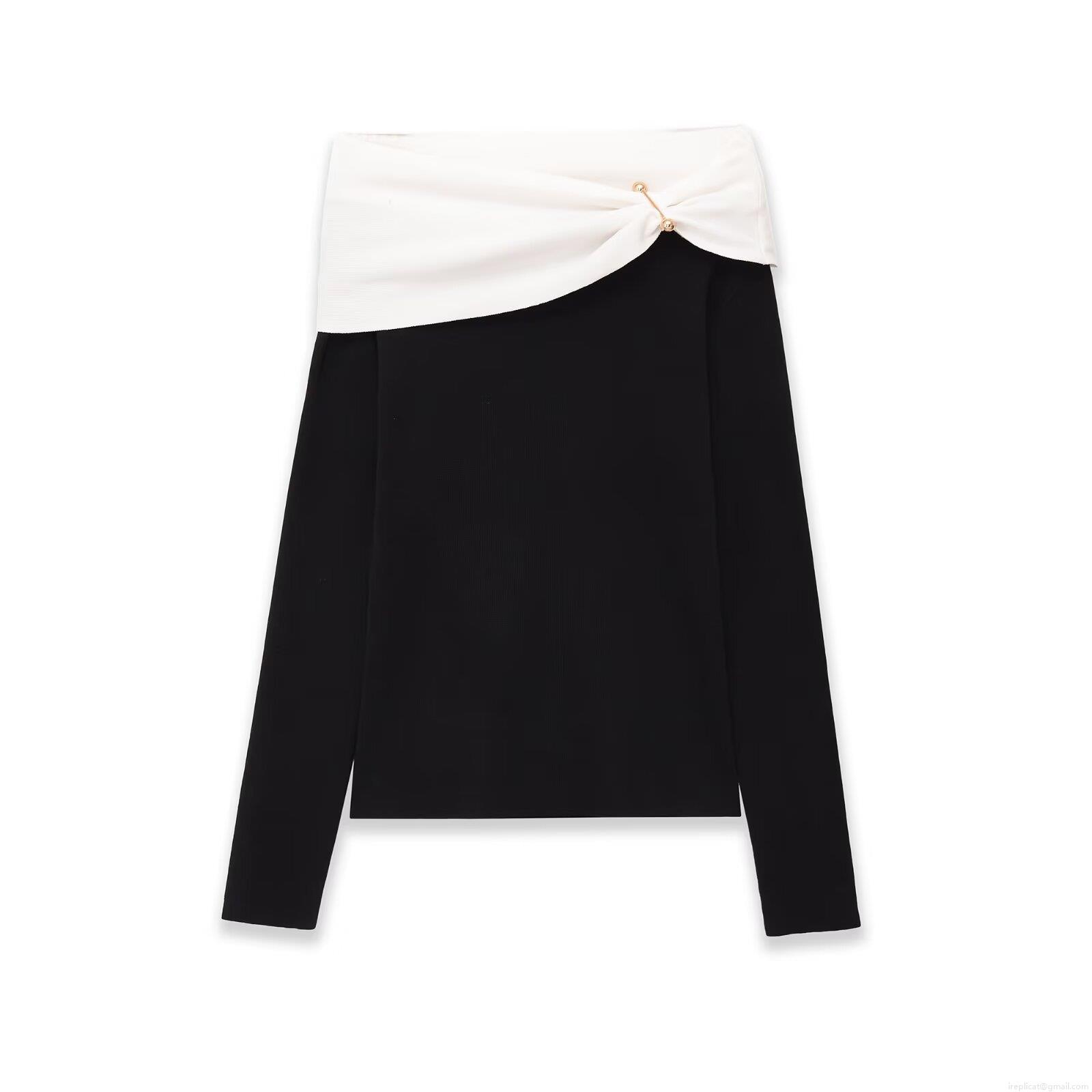 Women Off Shoulder Knit Long Sleeve Top Sexy Twist Knot Boat Neck T-Shirt With Gold Metal Buckle Solid Color Ribbed Slim Fit Casual Blouse For Daily Dating Lady
