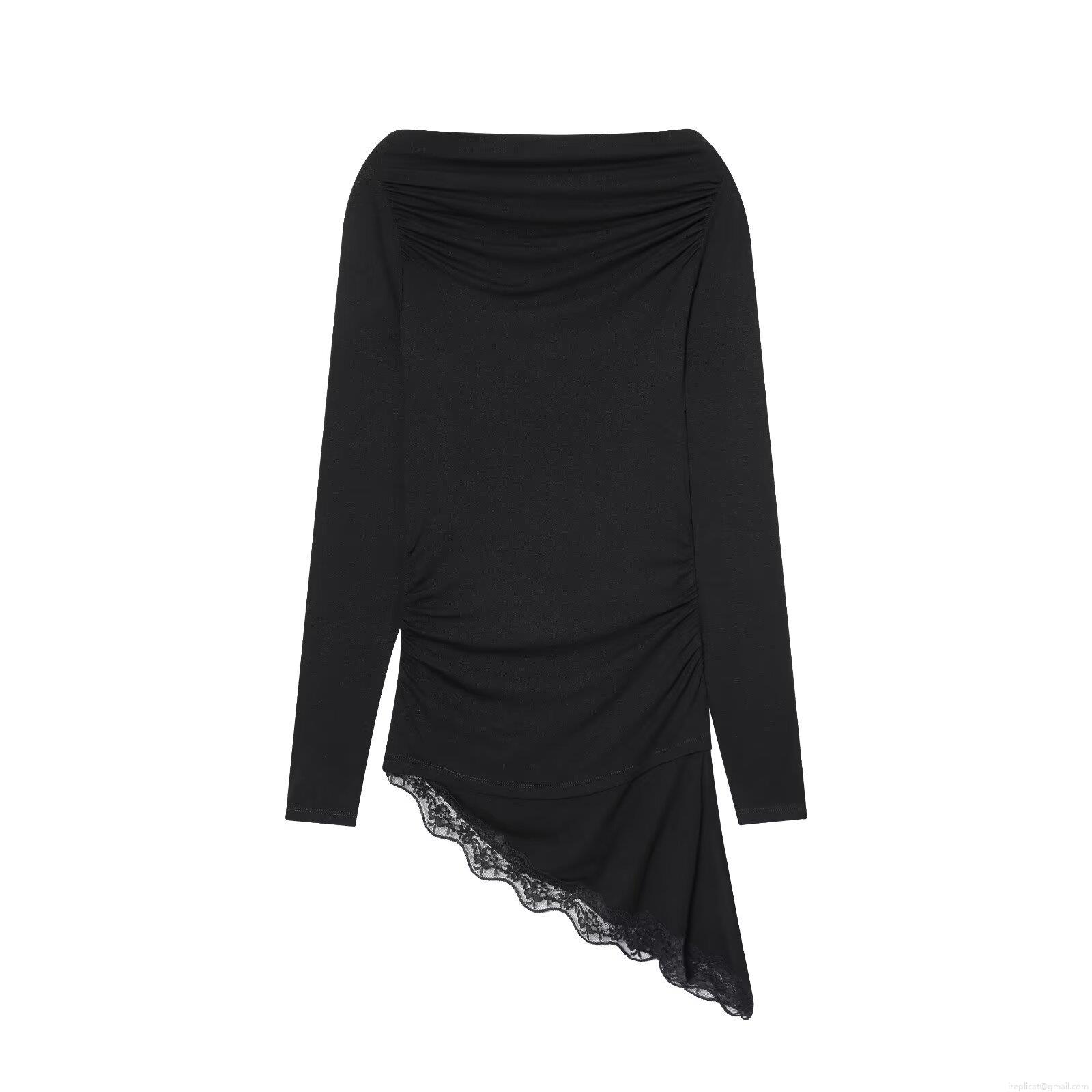 Women Off-Shoulder Long Sleeve T-Shirt With Asymmetric Lace Hem Ruched Side Solid Color Slim Fit Streetwear Top For Autumn Casual Daily Wear