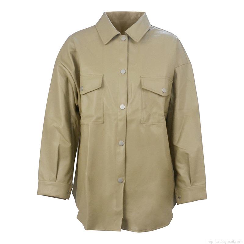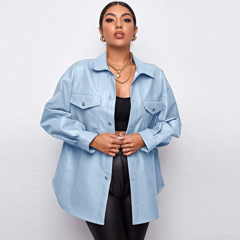 Women Oversized PU Faux Leather Shacket Jacket Turn-down Collar Button Down Long Sleeve Top With Pockets Casual Streetwear Outerwear For Ladies