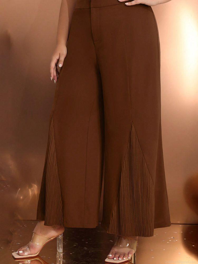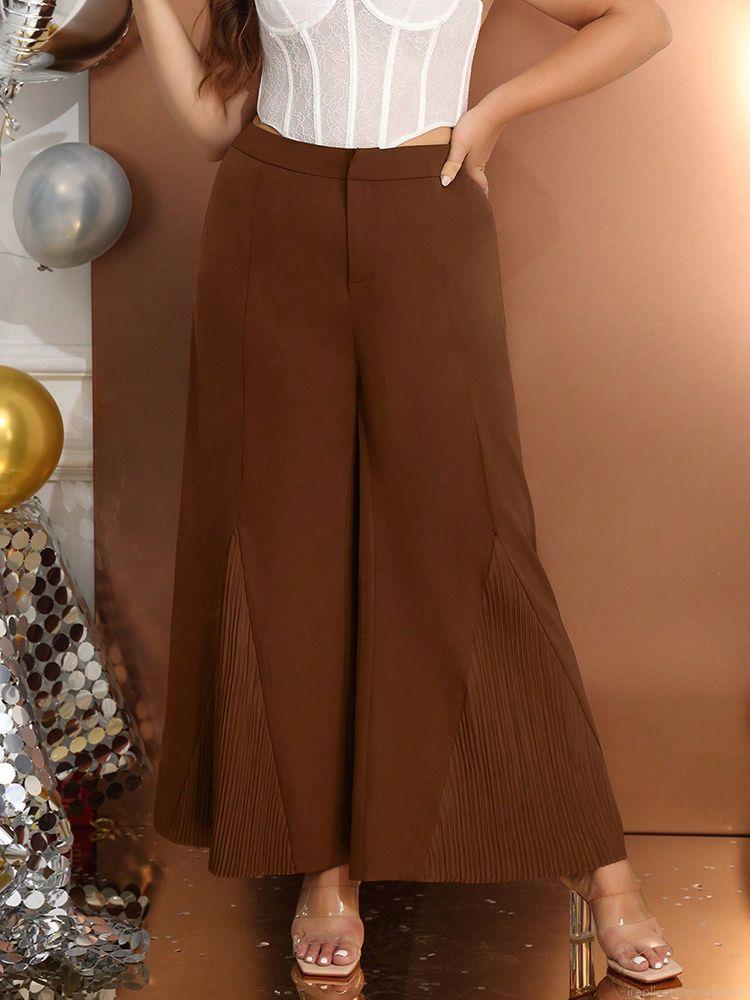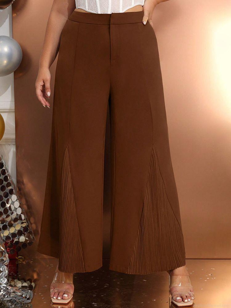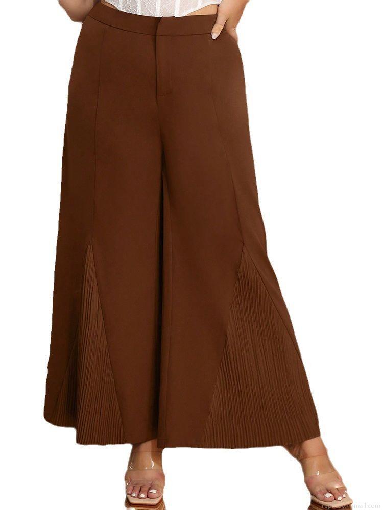 Women Plus Size High Waist Wide Leg Pants Elegant Pleated Hem Stitching Long Trousers Coffee Brown Fashionable Casual Loose Streetwear Trousers