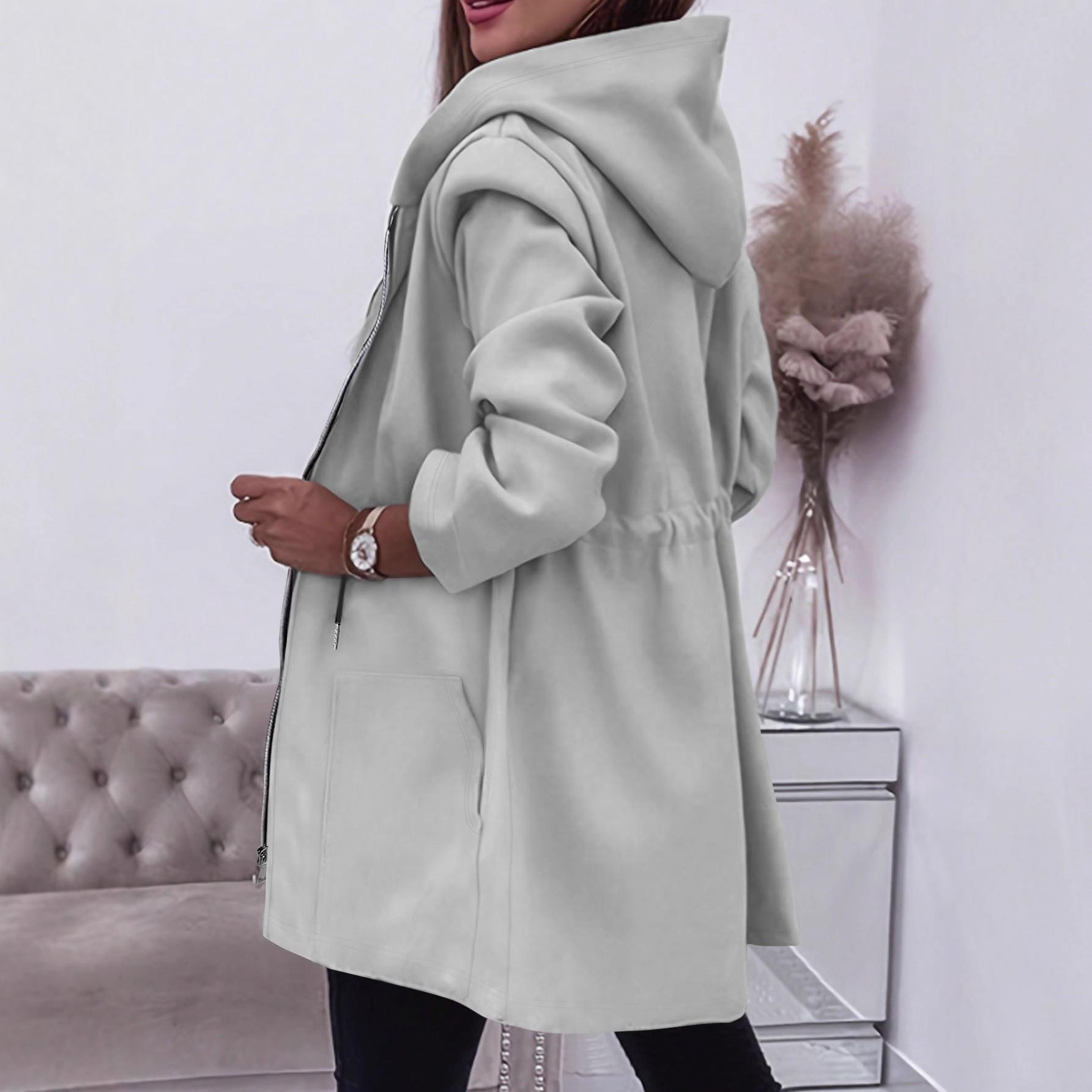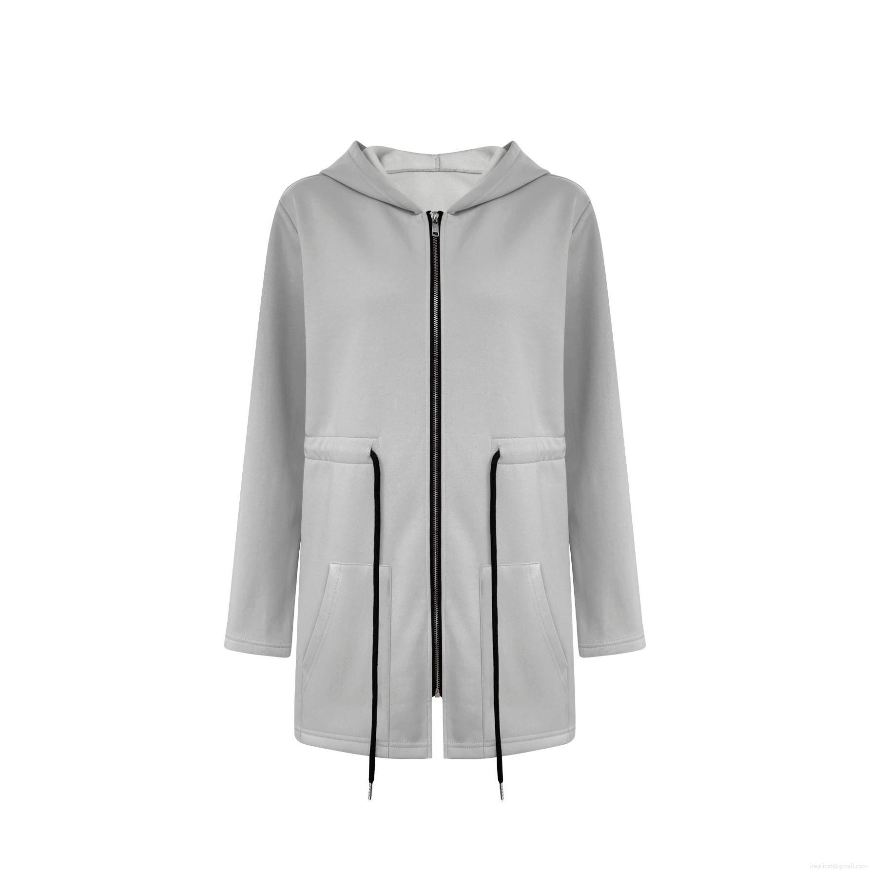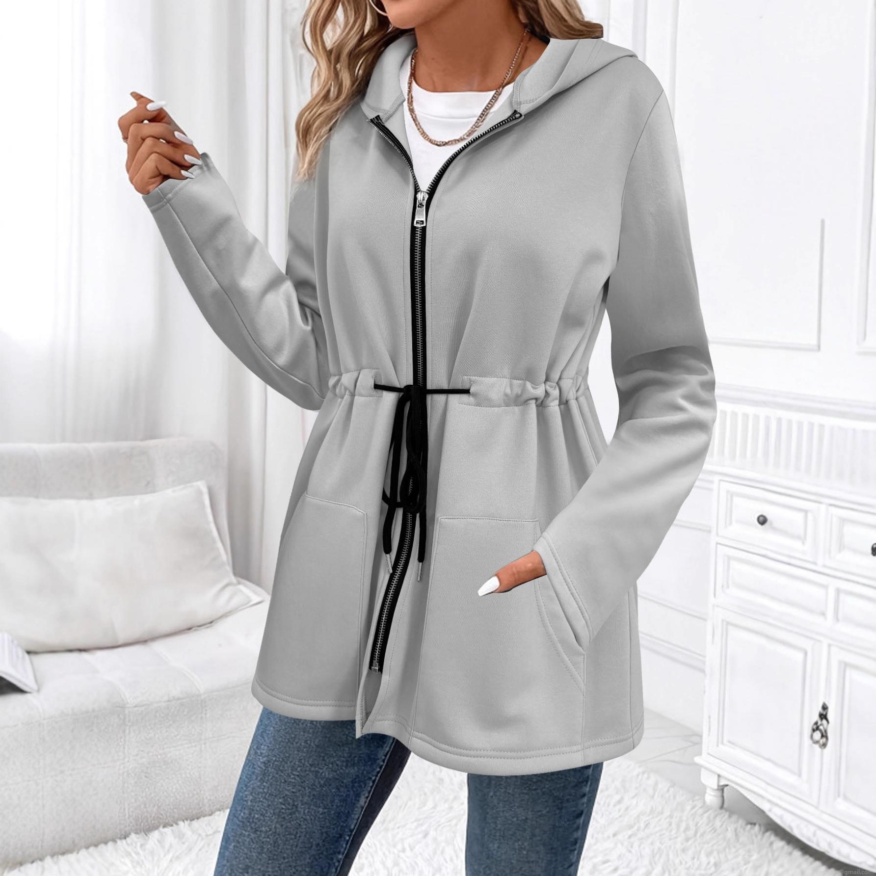 Women Plus Size Hooded Fleece Jacket-Casual Mid-Length Drawstring Waist Zip-Up Sweatshirt Coat-Autumn Winter Solid Color Warm Long Sleeve Outwear