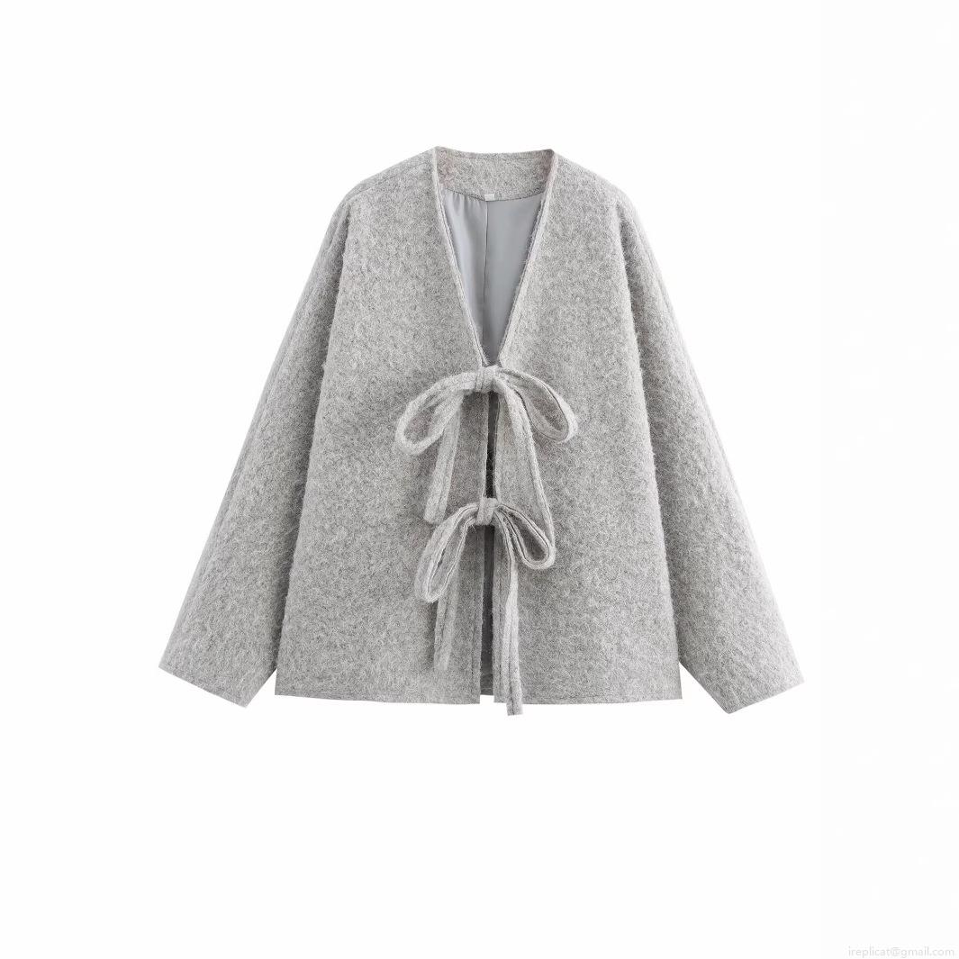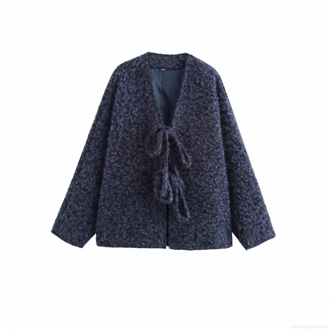 Women Plush Faux Fur Jacket Tie-Front Bow Cardigan Fleece Shaggy Solid Color Loose Fit Outerwear Autumn Winter Casual Elegant Long Sleeve Coat For Ladies