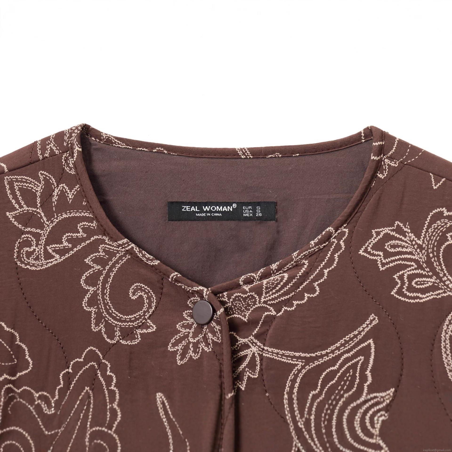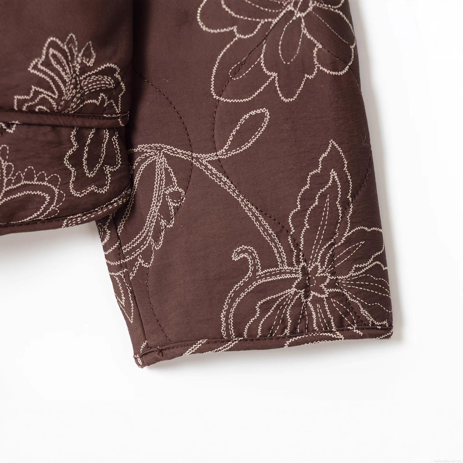 Women Quilted Baseball Jacket Brown Flower Embroidery Long Sleeve Snap Button Polyester Casual Streetwear Outerwear Coat For Autumn Ladies