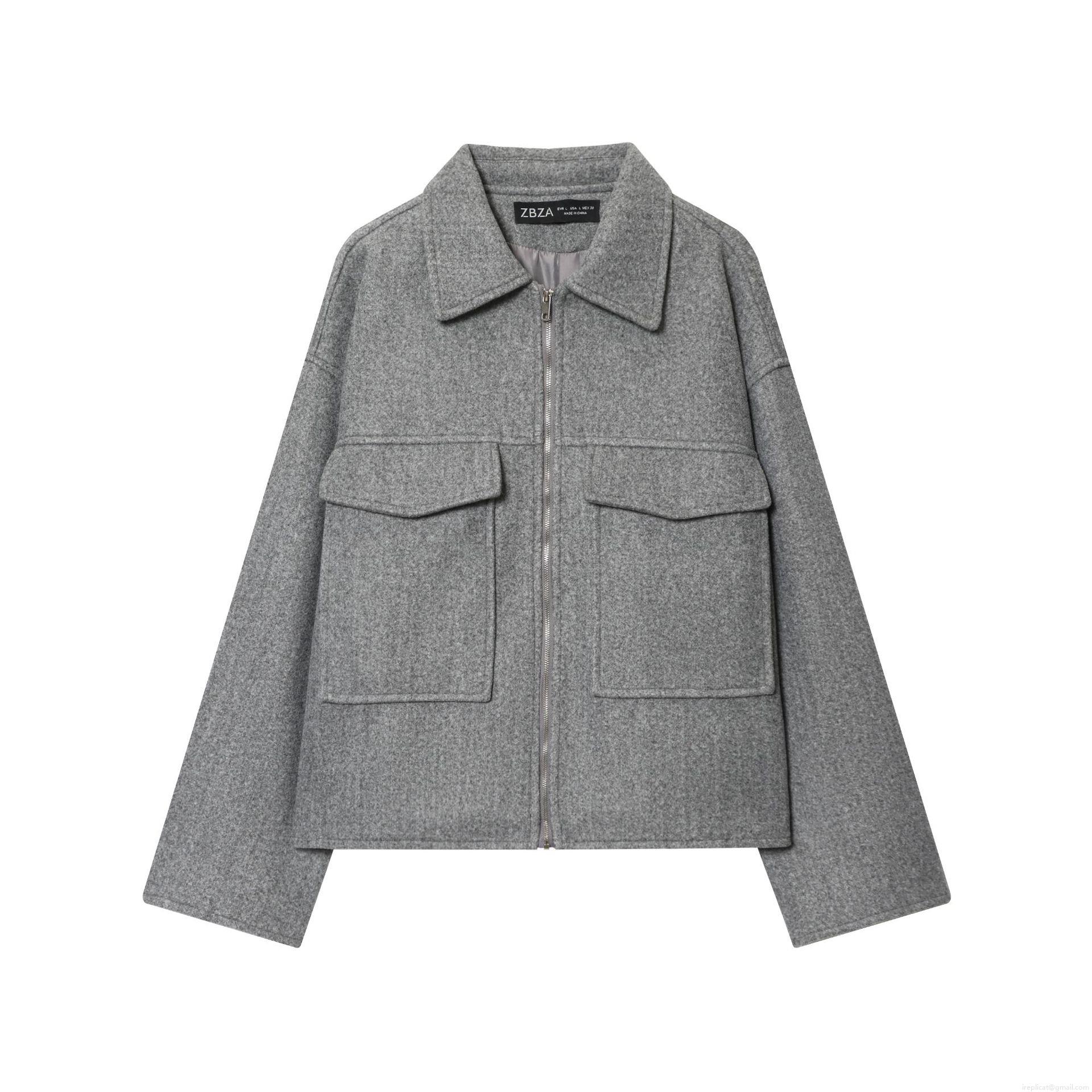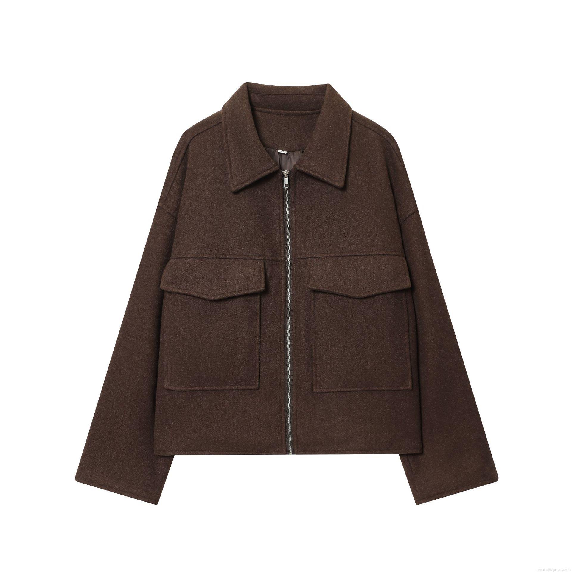 Women Retro French Style Woolen Jacket Solid Color Zipper Lapel Coat With Large Pockets Casual Long Sleeve Warm Outwear For Winter Autumn