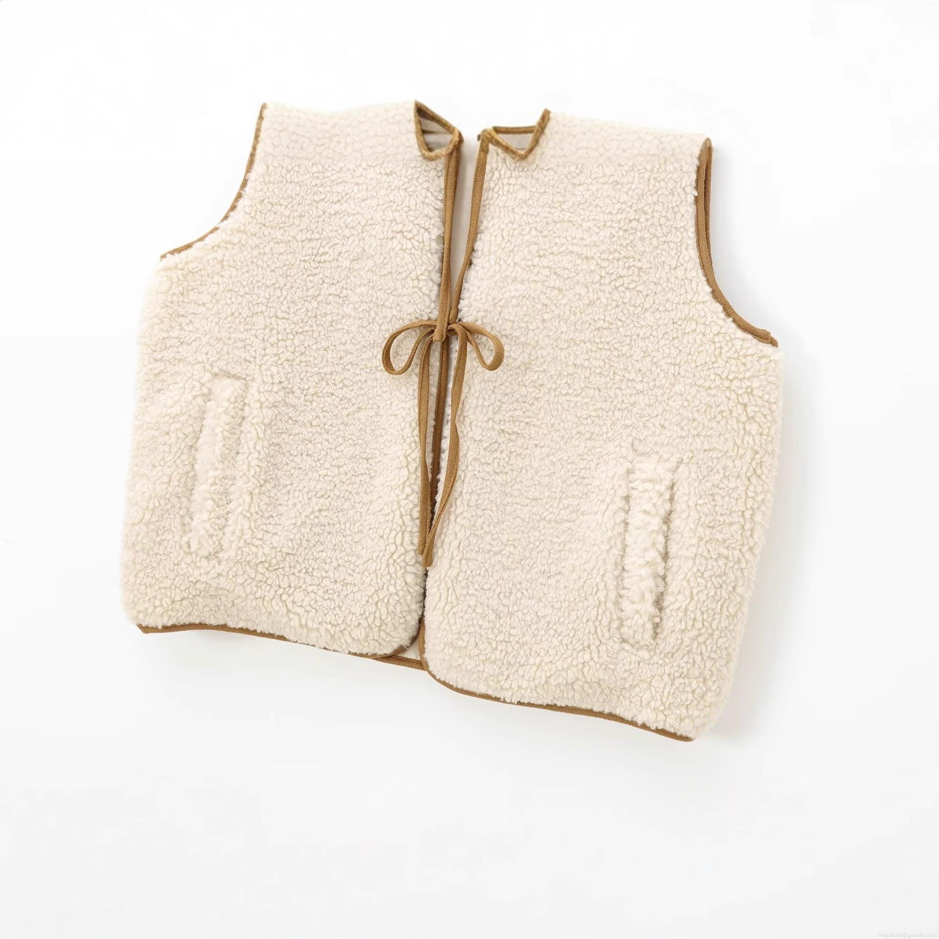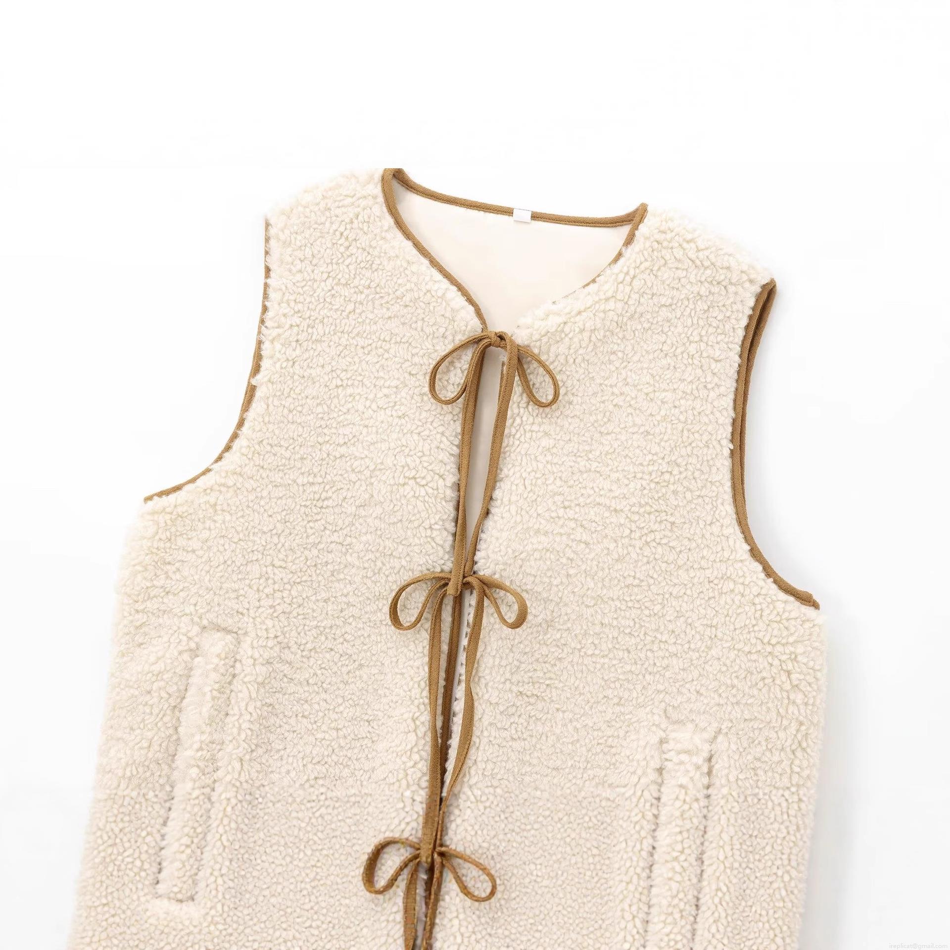 Women Retro Lamb Wool Vest Suede Fleece Contrast Binding Bow Tie Cardigan Daily Casual Sleeveless Jacket Sweet Vintage Women Outwear