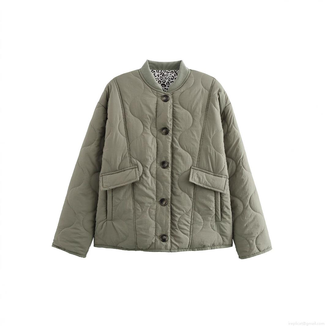 Splice, Leopard Print, Button Decoration, Flap Pocket, Ribbed Collar, Wavy Quilting, Gourd-shaped Quilting