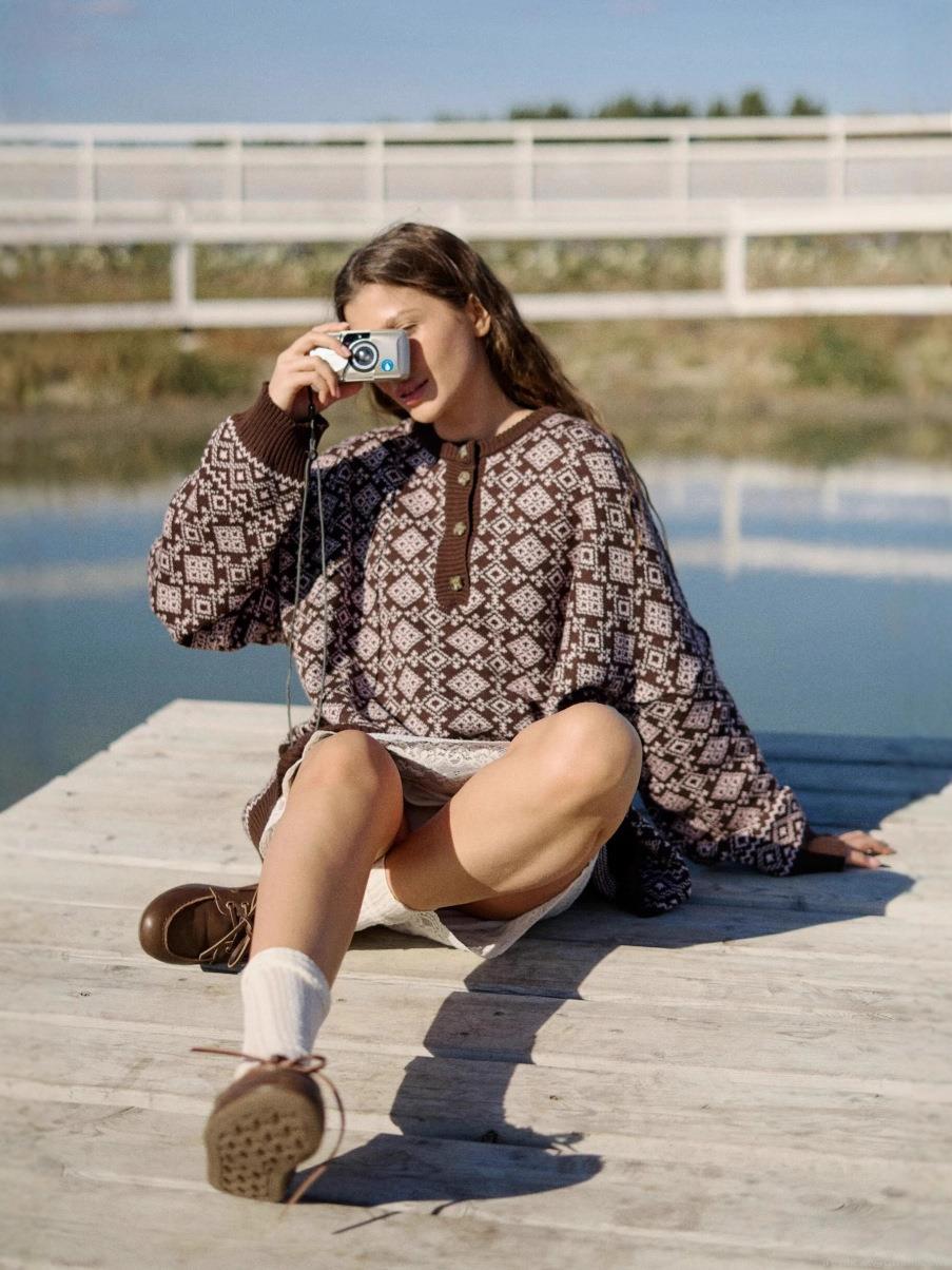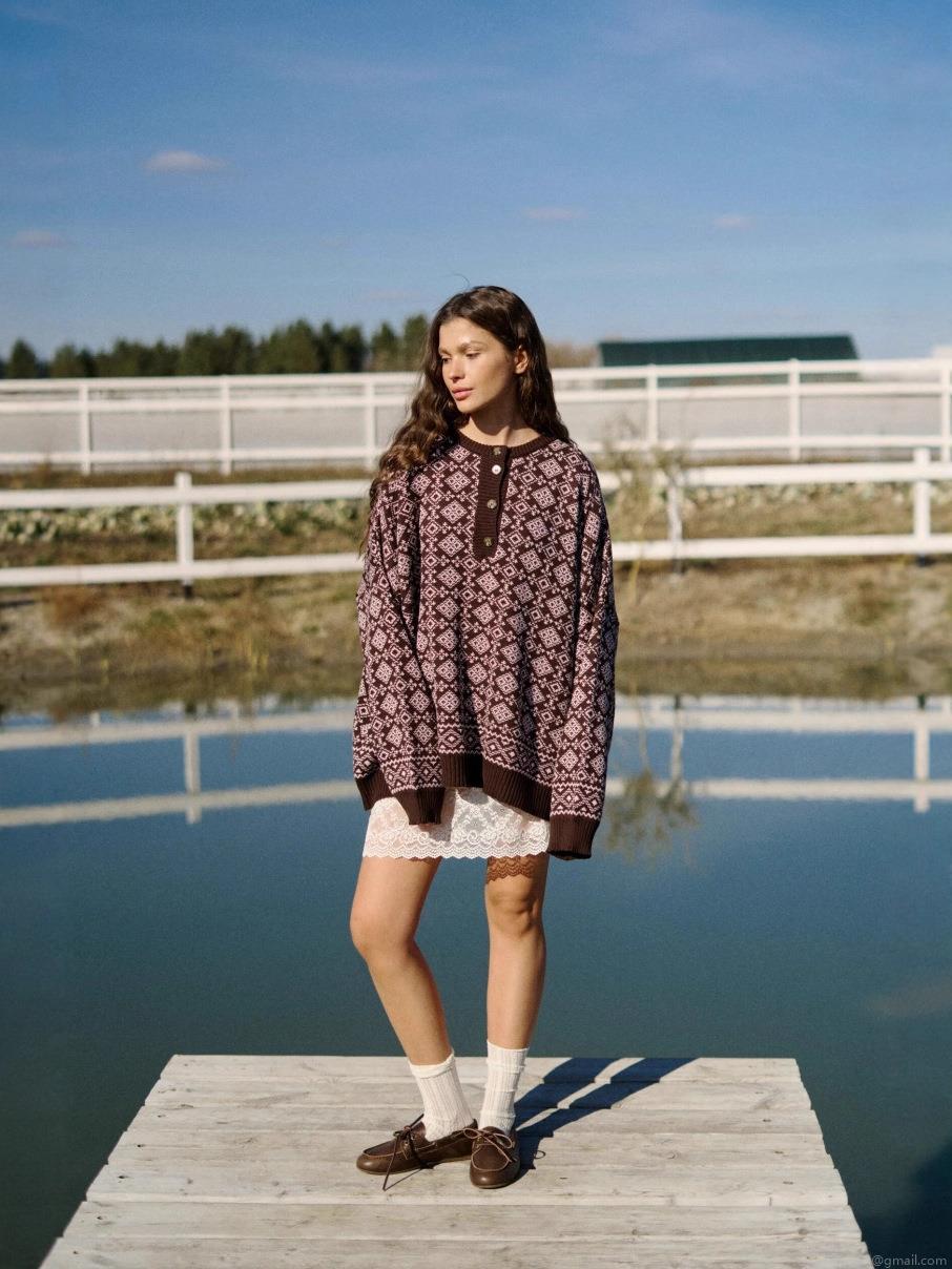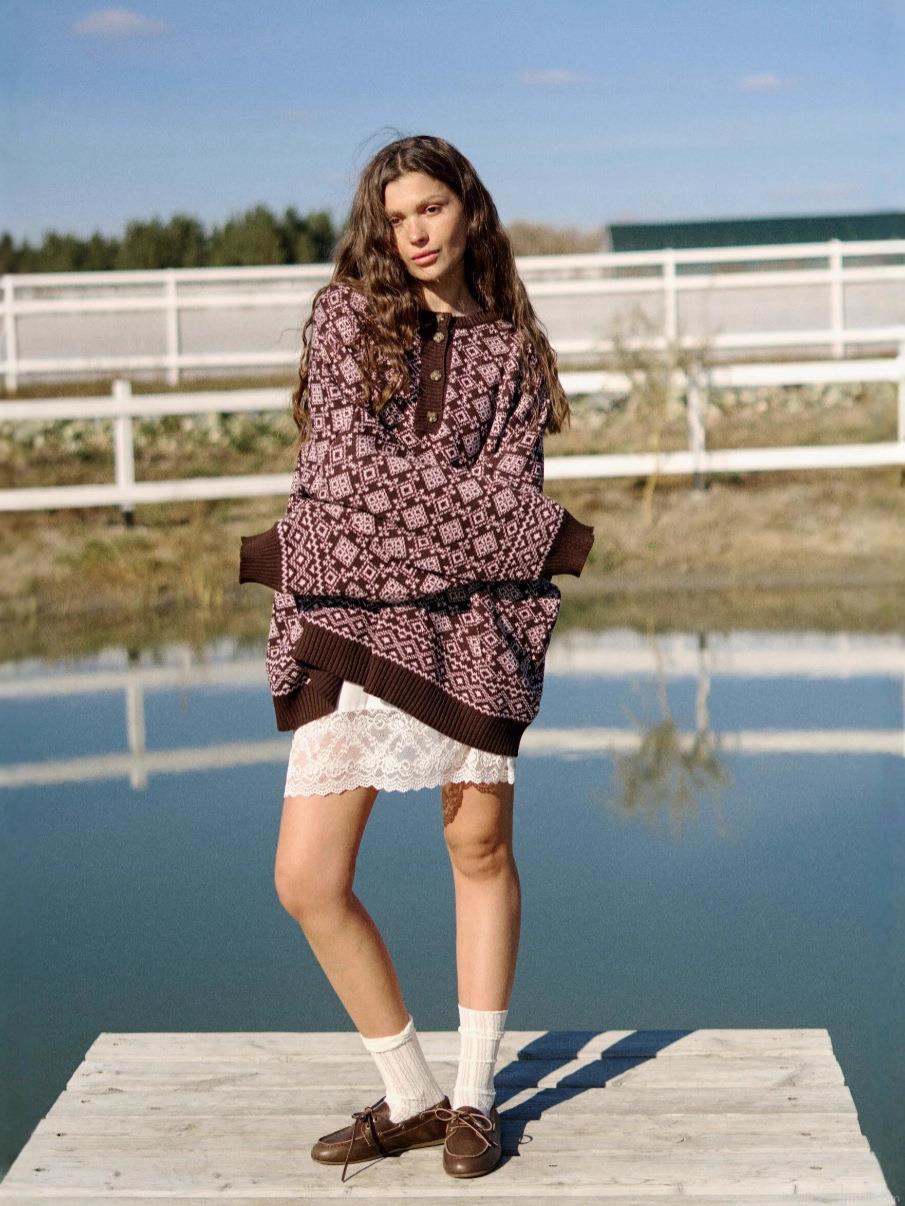 Women Retro Vintage Geometric Jacquard Knitted Sweater Loose Fit Long Sleeve Cotton Blend Pullover With Half Button Collar Casual Lazy Style Warm Jumper For Autumn Winter