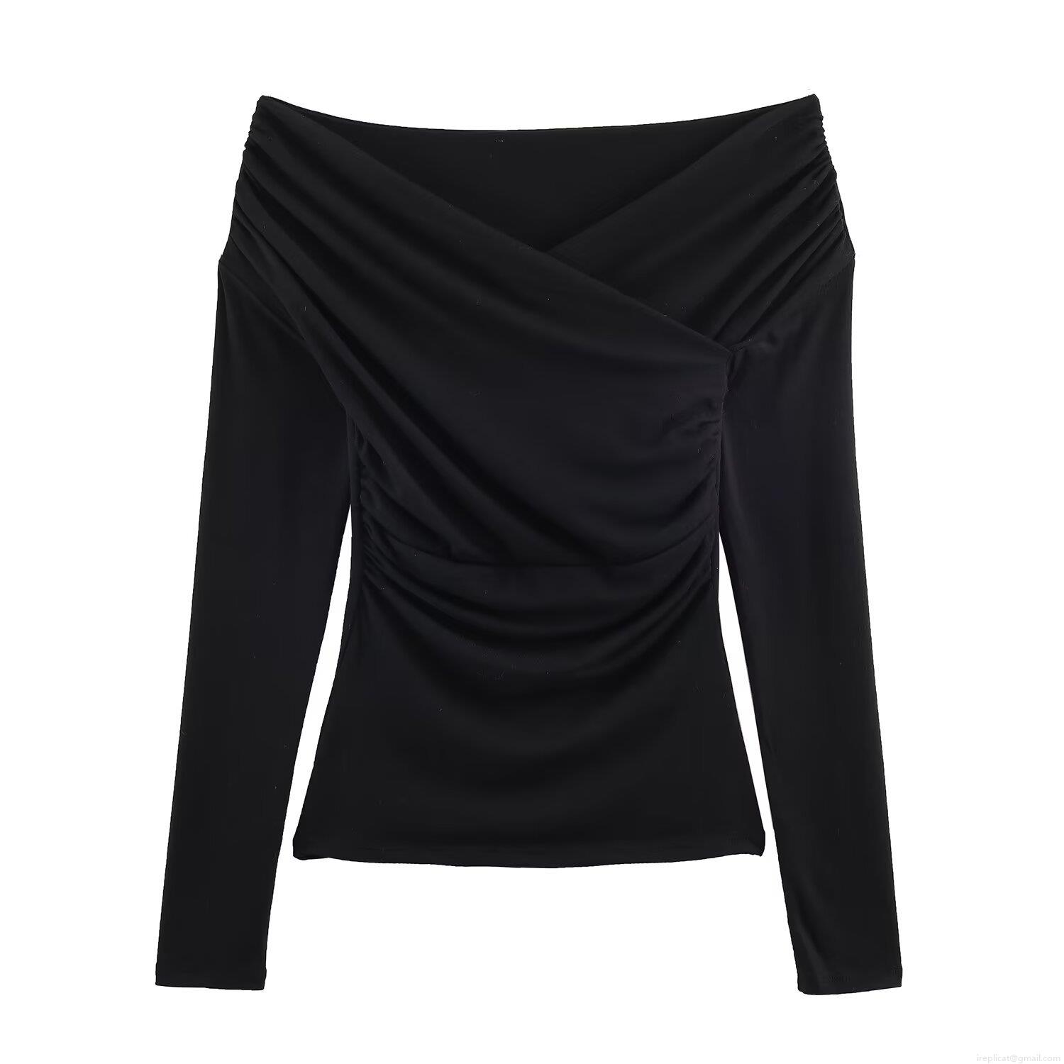 Women Ruched Wrap V-Neck Off Shoulder Long Sleeve Top Slim Fit Polyester Solid Color Elegant Pleated Streetwear Casual Basic Tee Shirt