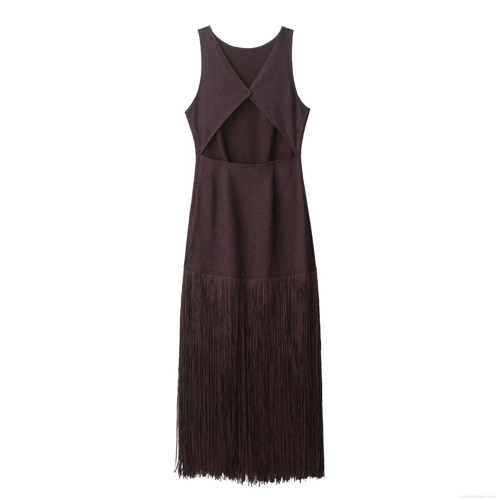 Women Sexy Backless Fringe Midi Dress Sleeveless Round Neck Textured Slim Fit Tassel Hem Elegant Party Evening Club Bodycon Dresses