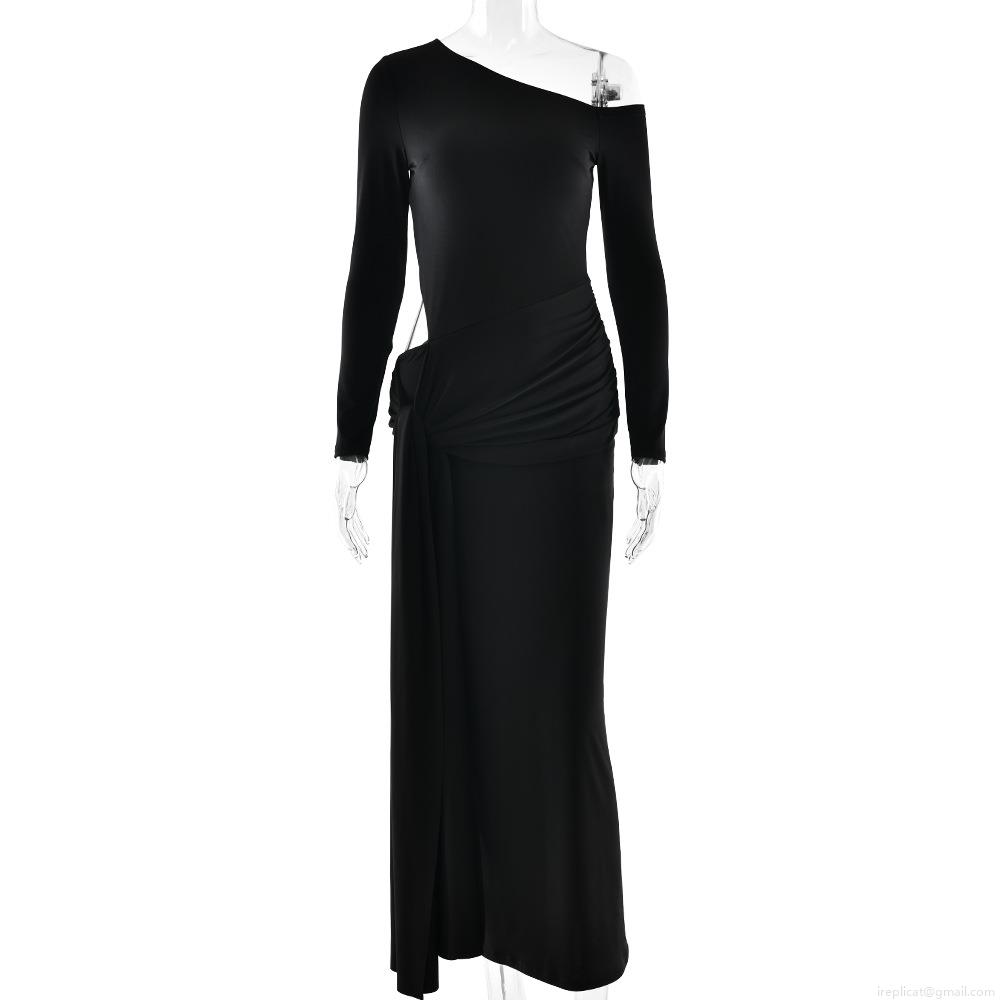 Women Sexy Cut-Out Waist Long Sleeve Maxi Dress Western Style Asymmetric Neck Twist Knot Ruched Tie Detail Solid Color Evening Party Wear