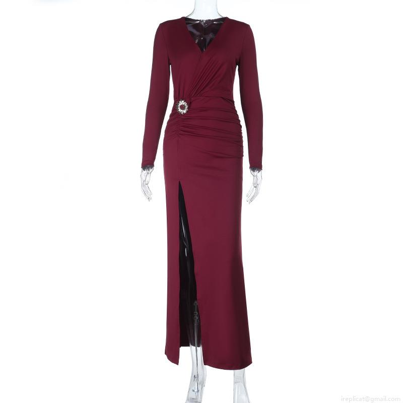 Women Sexy Deep V-Neck Long Sleeve Slit Evening Dress Elegant Polyester Spandex Bodycon Maxi Party Gown With Sunflower Metal Buckle Burgundy Black