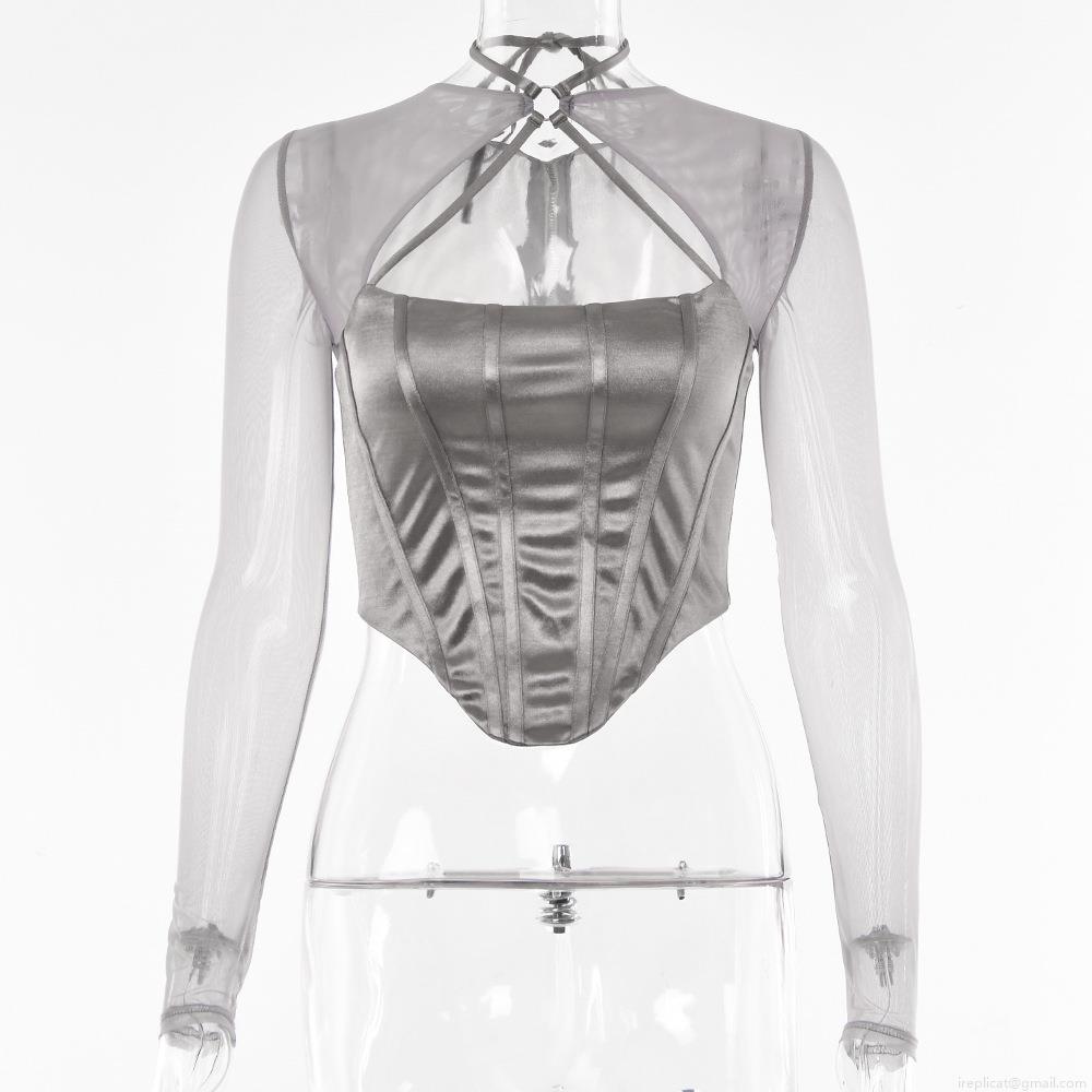 Women Sexy Grey Mesh Patchwork T-Shirt Long Sleeve V Neck Sheer Corset Top With Halter Tie Up Backless Irregular Hem Streetwear For Party Club