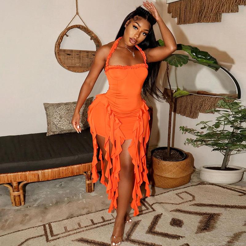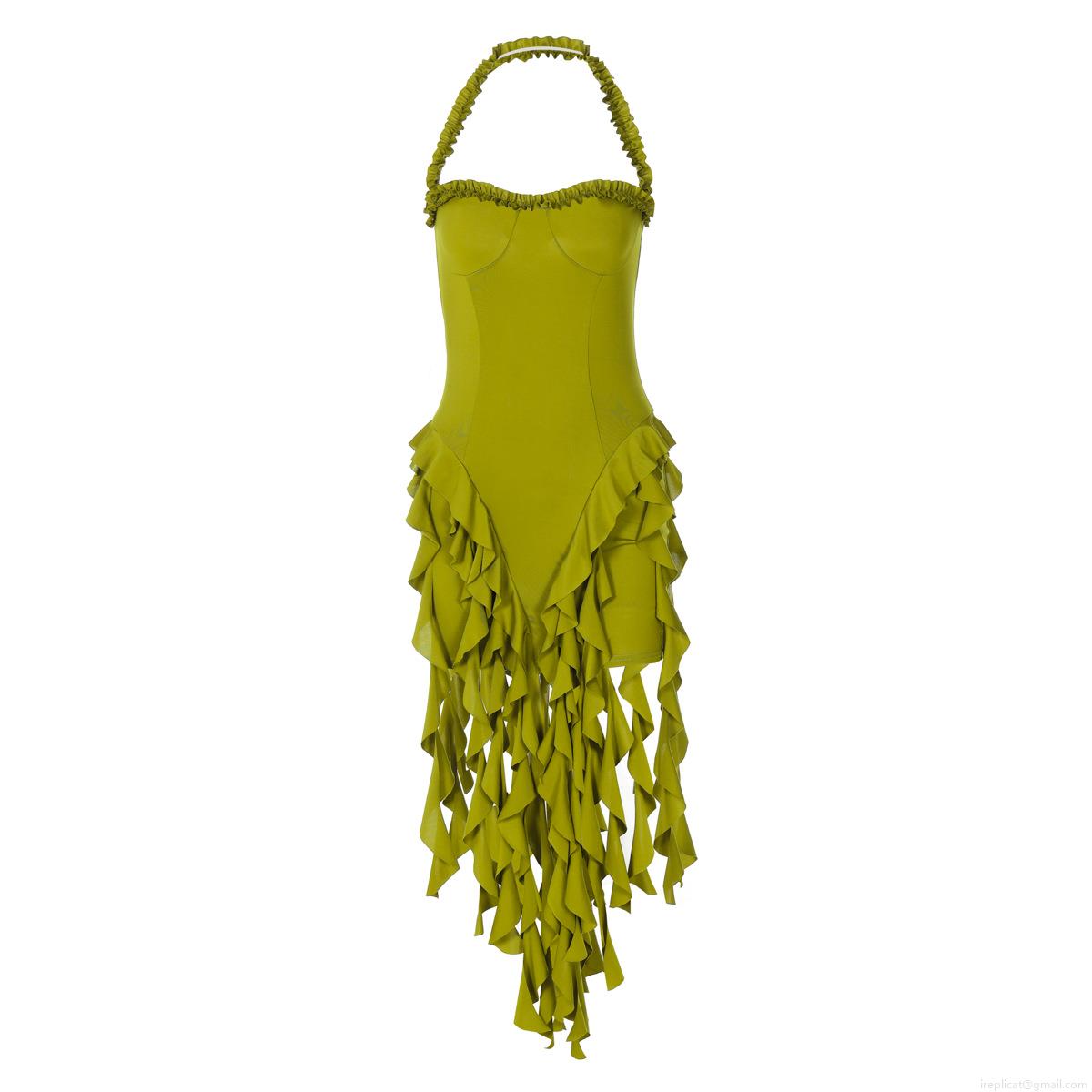 Solid Color, Ruffles, Neckband, Backless, Irregular Hem