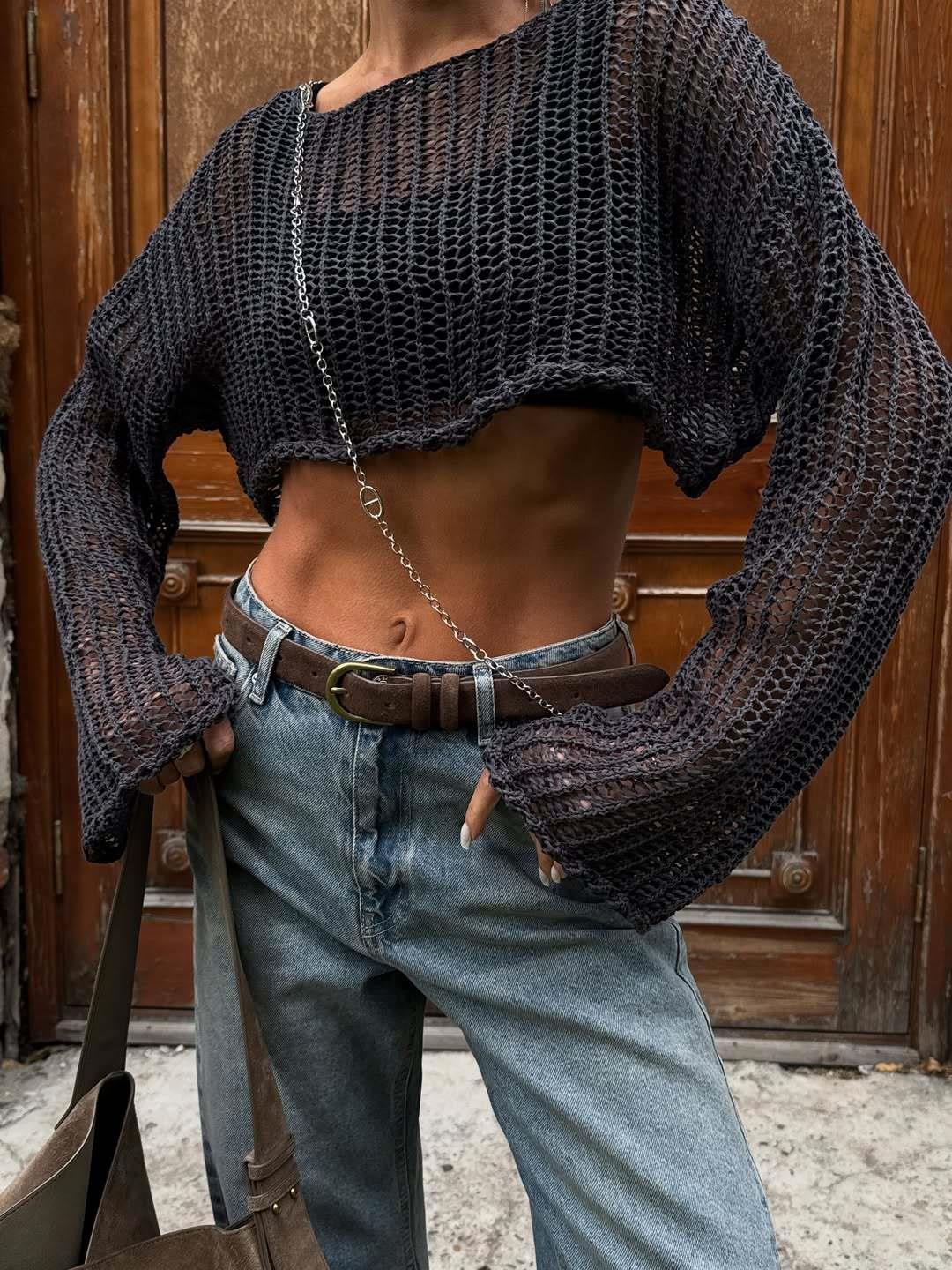 Women Sexy Hollow Out Knit Sweater Cotton Blend Long Sleeve Round Neck Perspective Mesh Crop Top Pullover Casual Streetwear Jumper Navel Exposed Knitwear