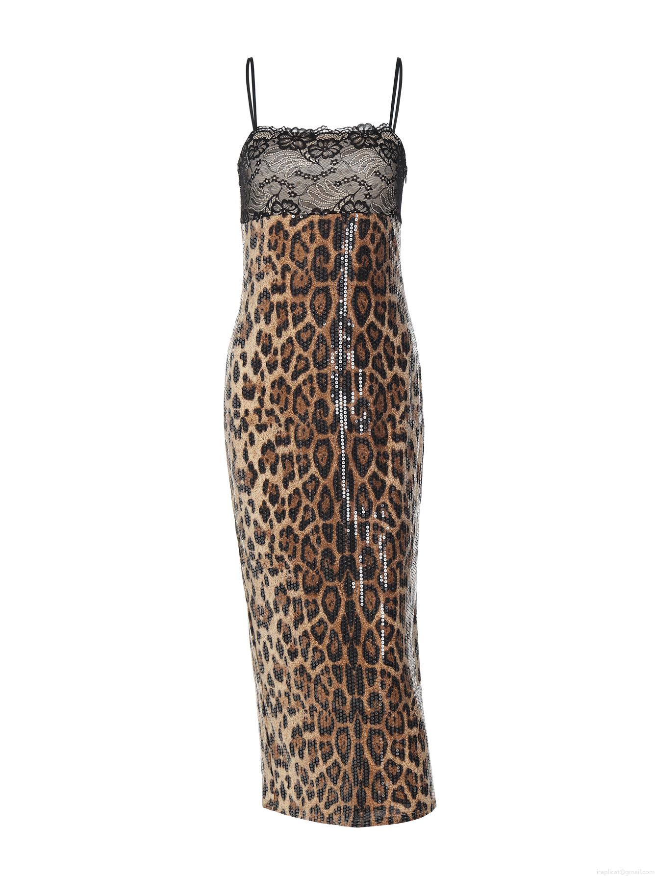 Women Sexy Leopard Print Sequin Midi Dress Black Lace Splicing Spaghetti Strap Bodycon Slit Cami Dress For Party Club Night Out Evening Vacation
