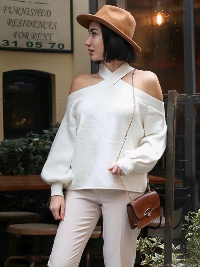 Women Sexy Off Shoulder Halter Knit Sweater Cross Wrap Long Sleeve Loose Solid Color Pullover Jumper For Autumn Winter Fashion