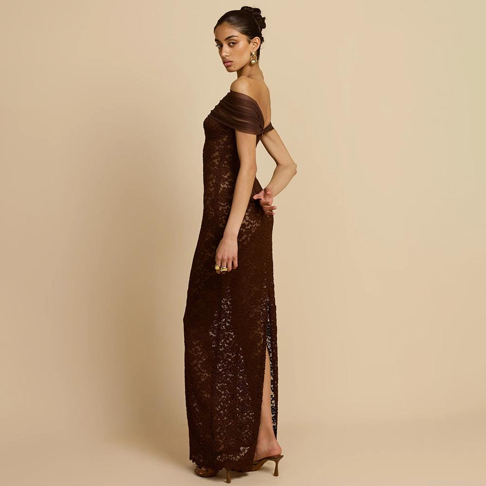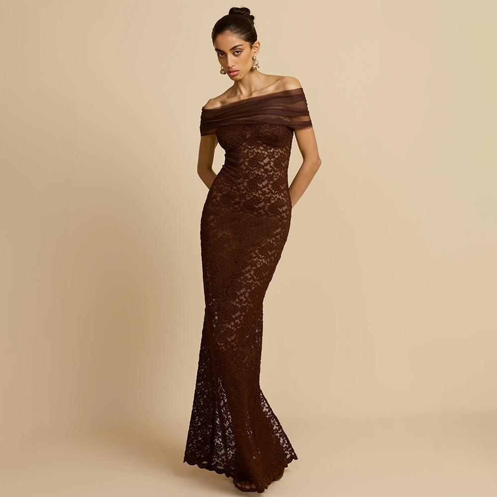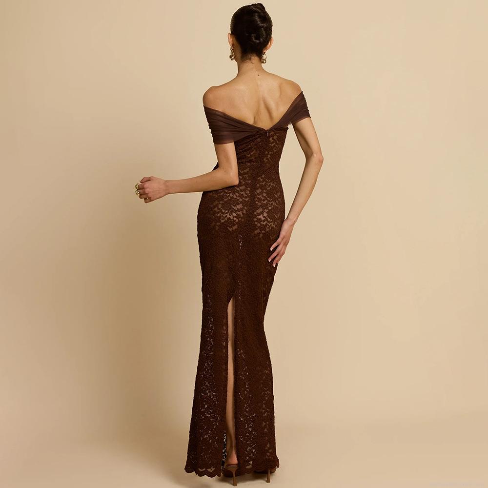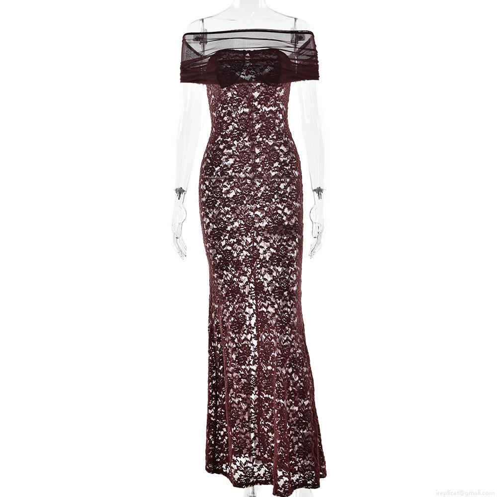 Women Sexy Off-Shoulder Lace Patchwork Mesh Fish-Tail Maxi Dress Elegant Sheer Bodycon Evening Party Banquet Gown With Back Slit