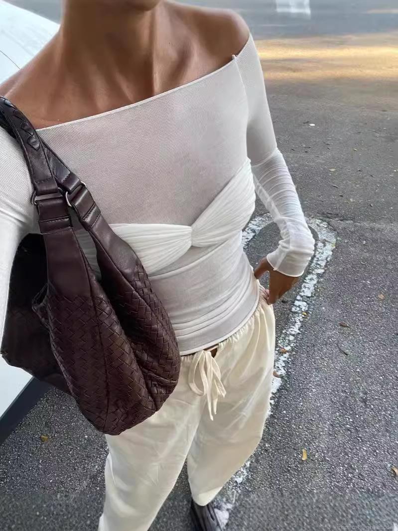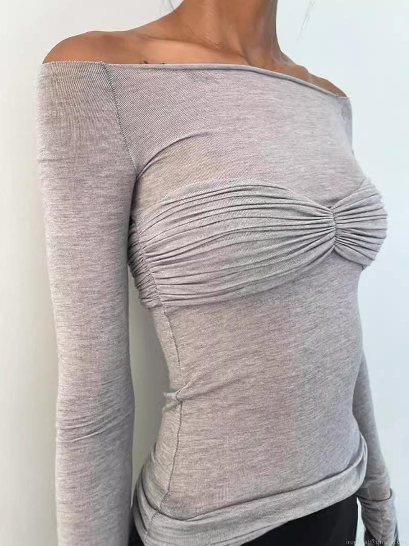 Women Sexy Off-Shoulder Long Sleeve Top Ruched Twist Front Slim Fit Polyester Knitted Shirt Party Date Night Streetwear Hot Girl Style Elegant Blouse