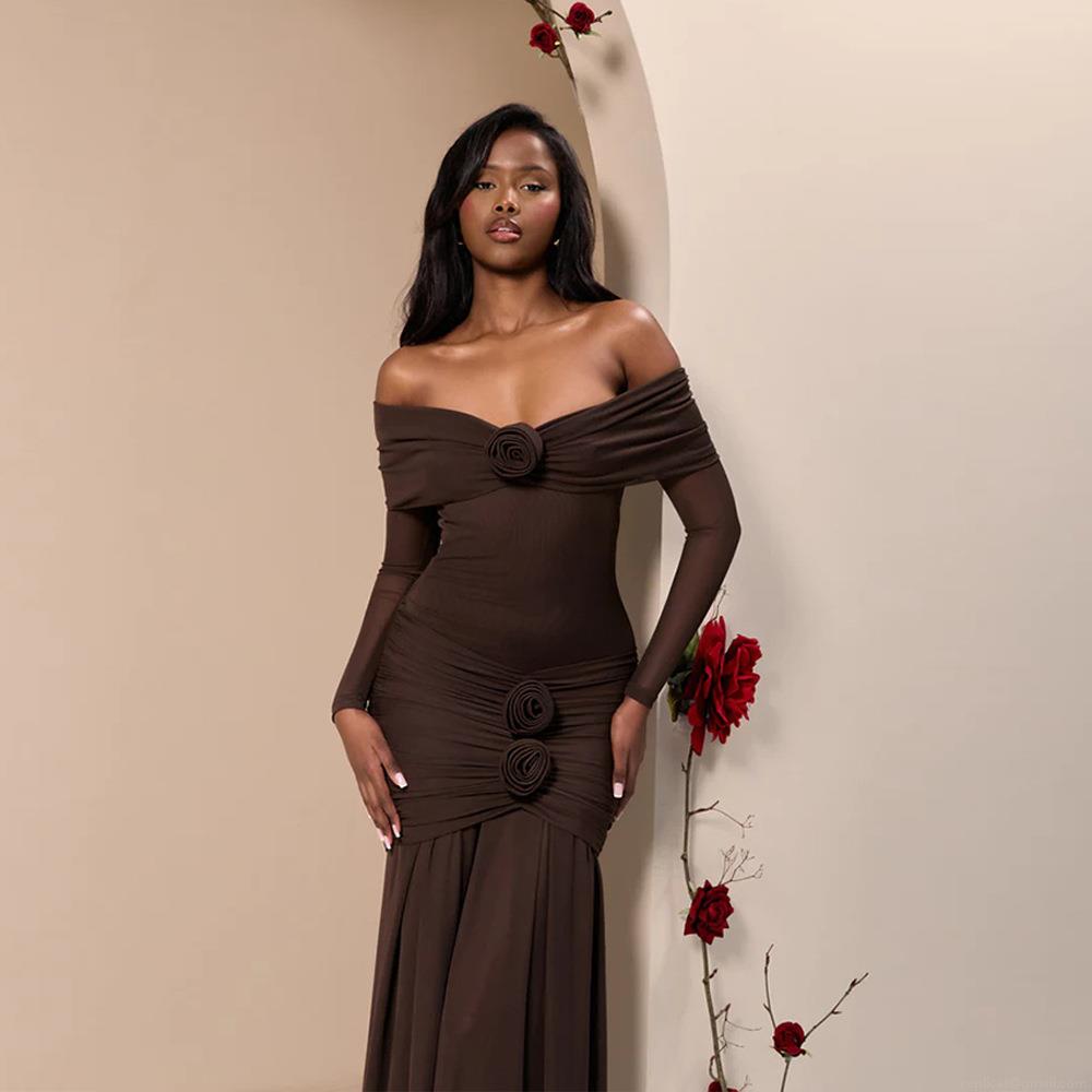 Women Sexy Off-the-Shoulder Maxi Dress Ruched 3D Rose Flower Long Sleeve Mesh Milk Silk Slim Fit Elegant Evening Party Dress For Women