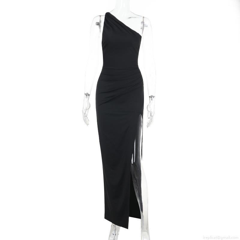 Solid Color, Pleats, Backless, Sloping Shoulders, Side Fork